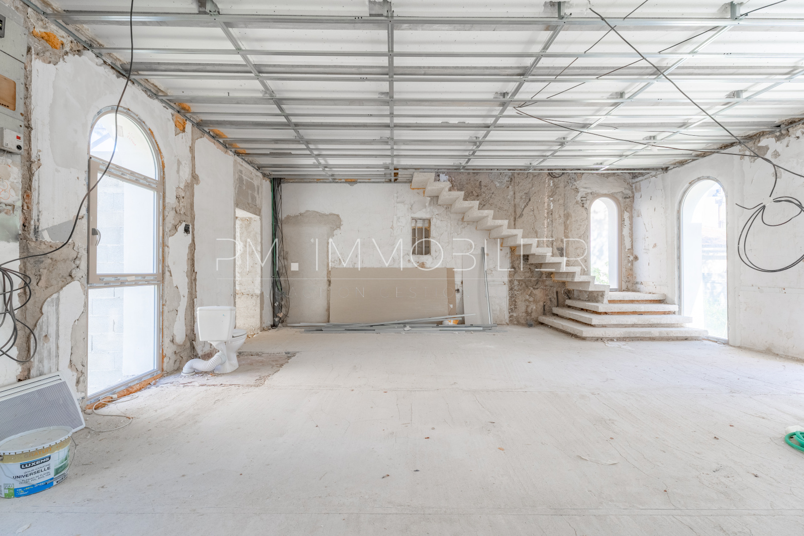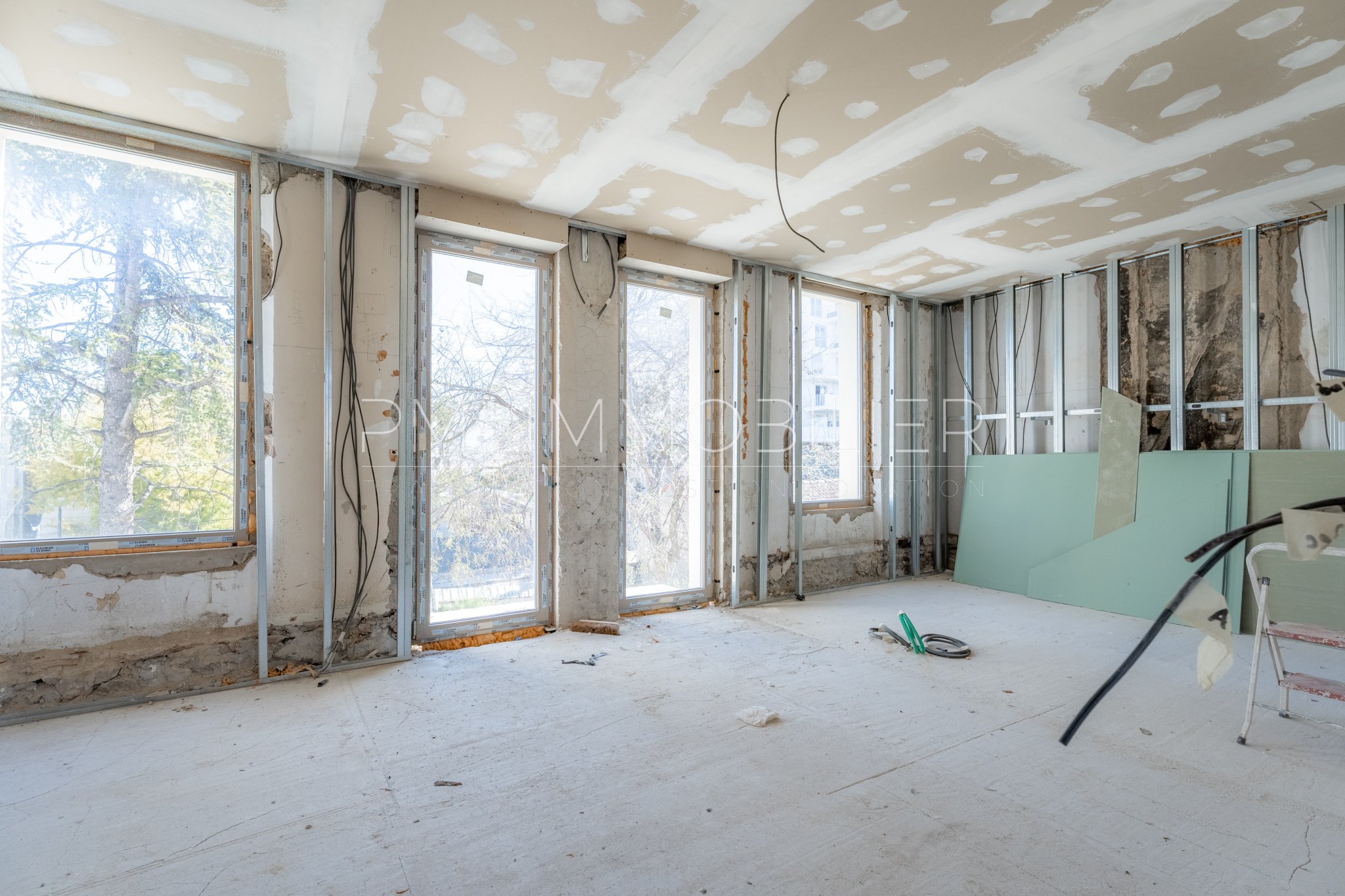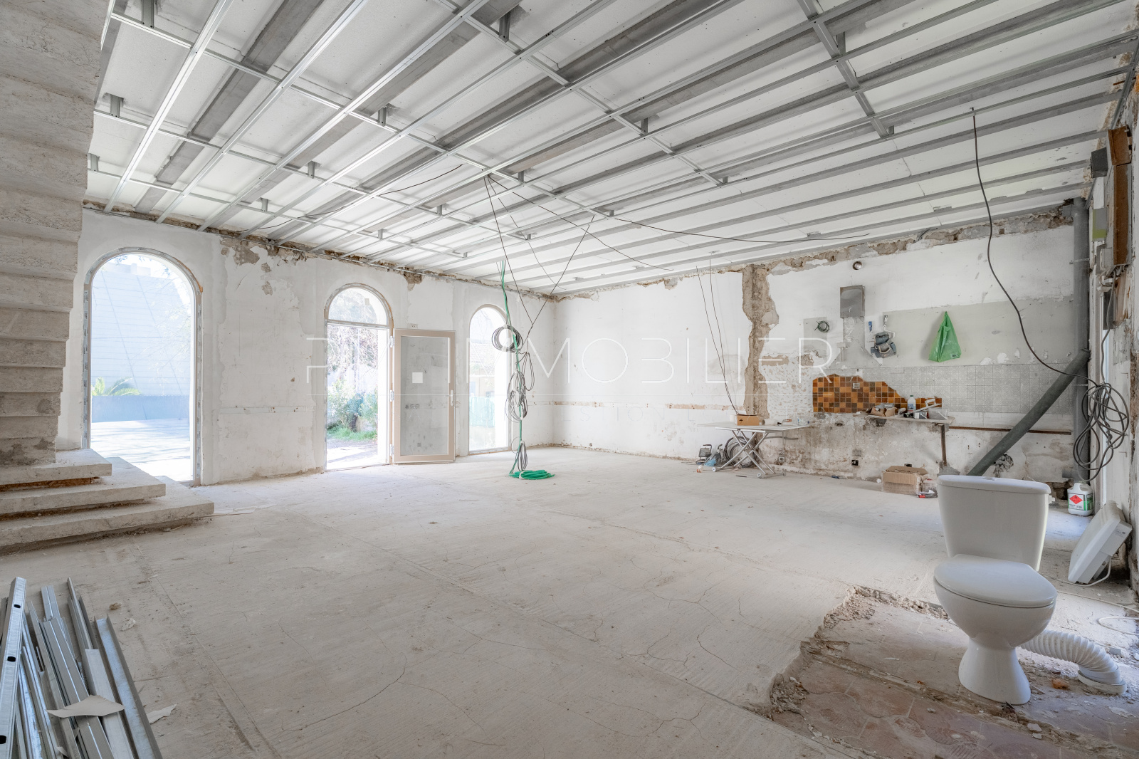 Derrière sa façade au charme patiné, cette bâtisse en cours de renaissance dévoile des volumes rares et une lumière omniprésente. Le rez-de-chaussée, entièrement décloisonné, laisse entrevoir une pièce de vie spectaculaire, baignée de soleil, ouverte sur le jardin.