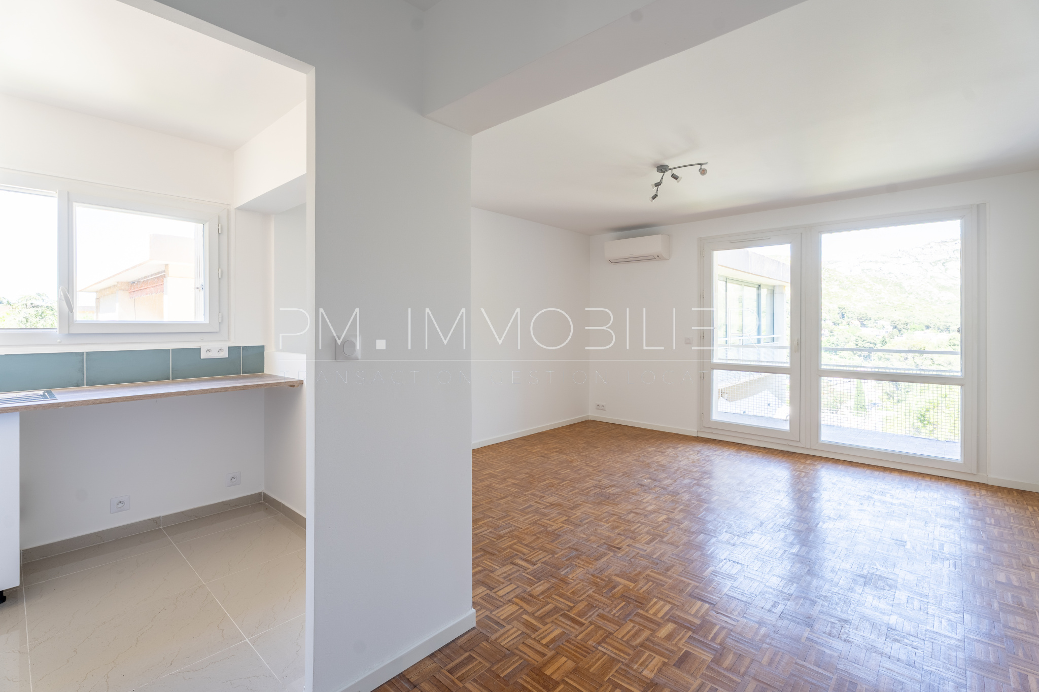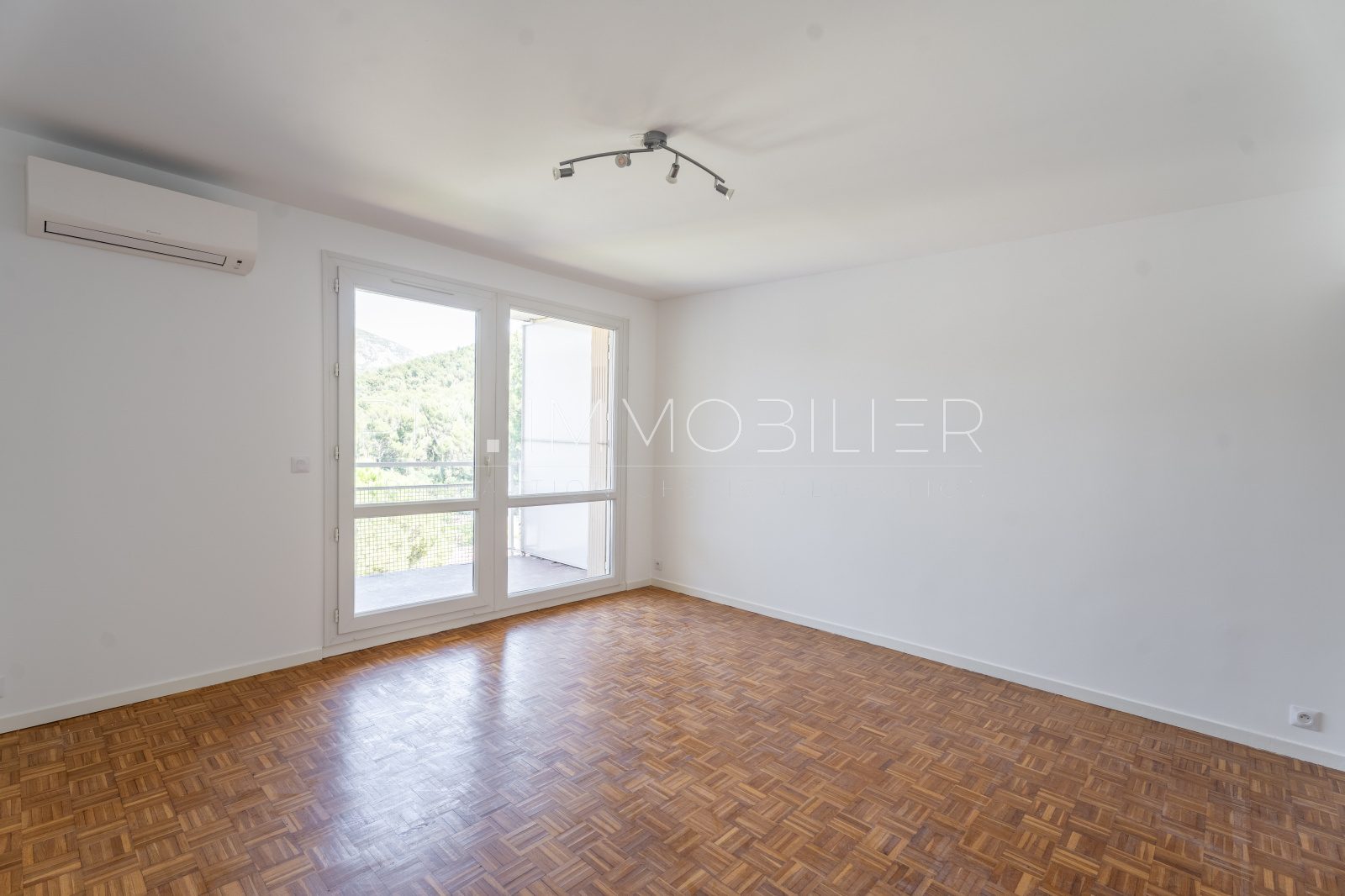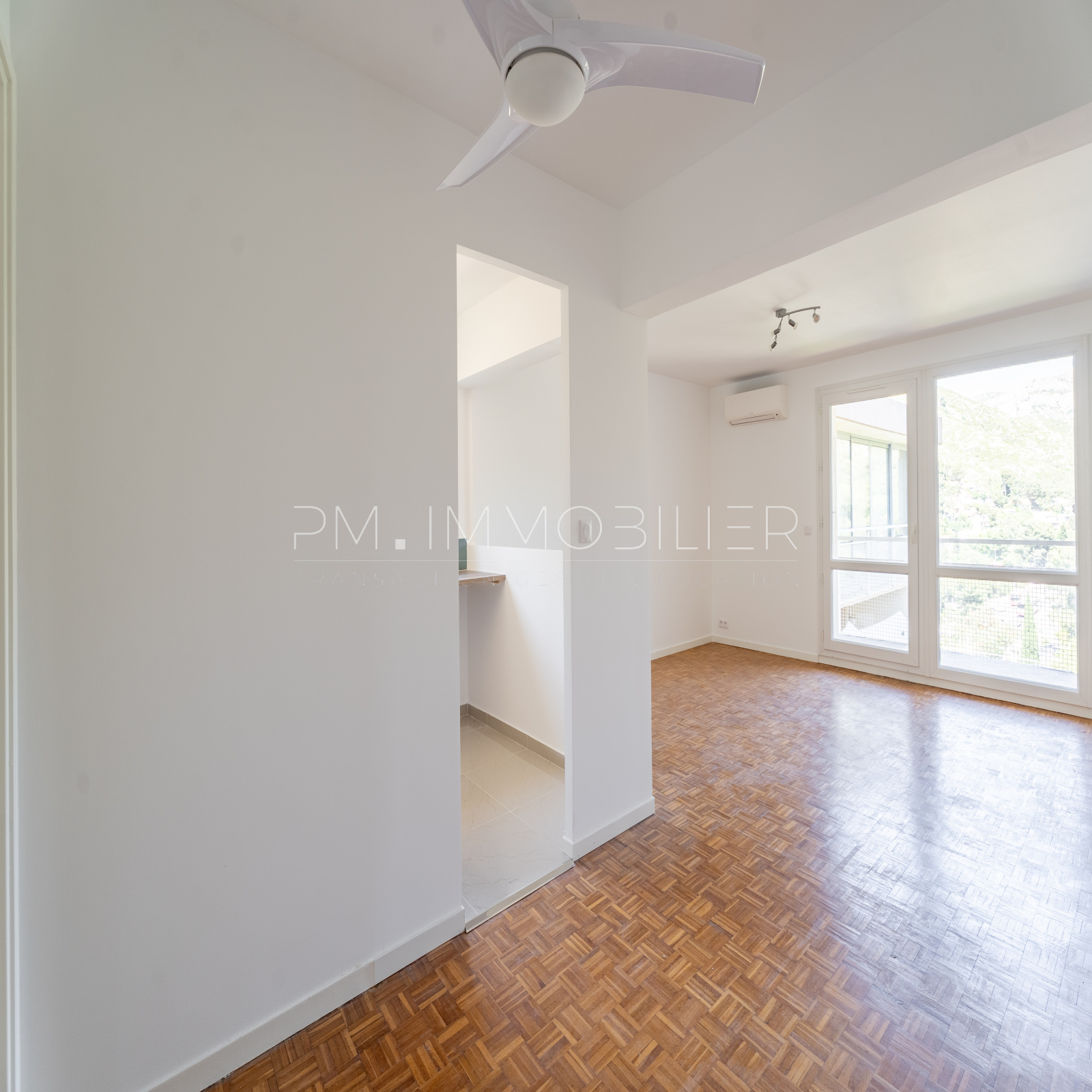 L’appartement se compose d’un séjour lumineux exposé plein Est, ouvrant sur une agréable terrasse avec une vue dégagée sur les collines. La cuisine, semi-ouverte sur la pièce de vie, a été rénovée dans un style sobre et moderne. La chambre est attenante à un grand dressing indépendant. La salle d’eau, également refaite à neuf, dispose d’une douche, d’un meuble vasque avec miroir, d’un sèche-serviettes et d’un WC.