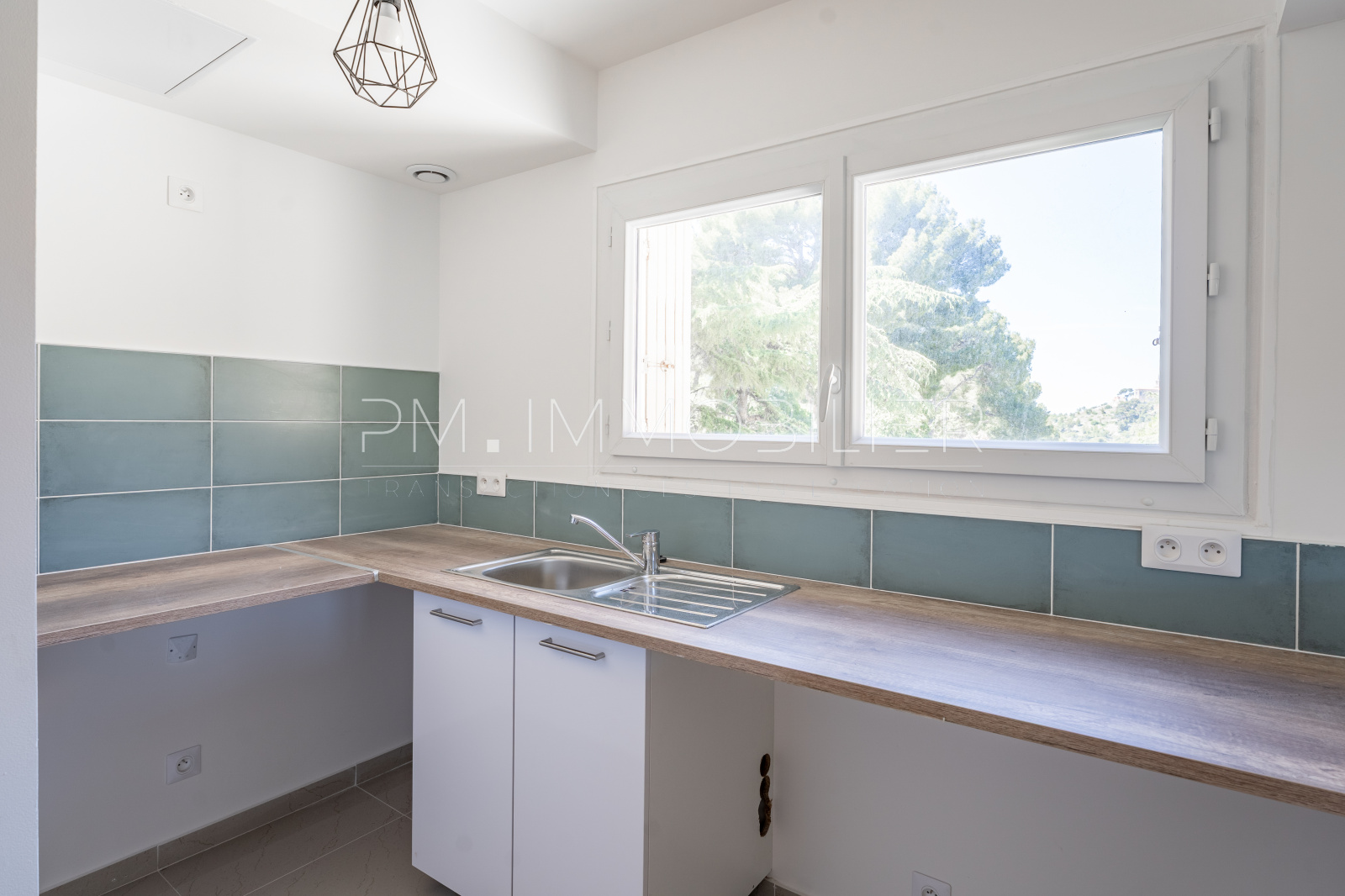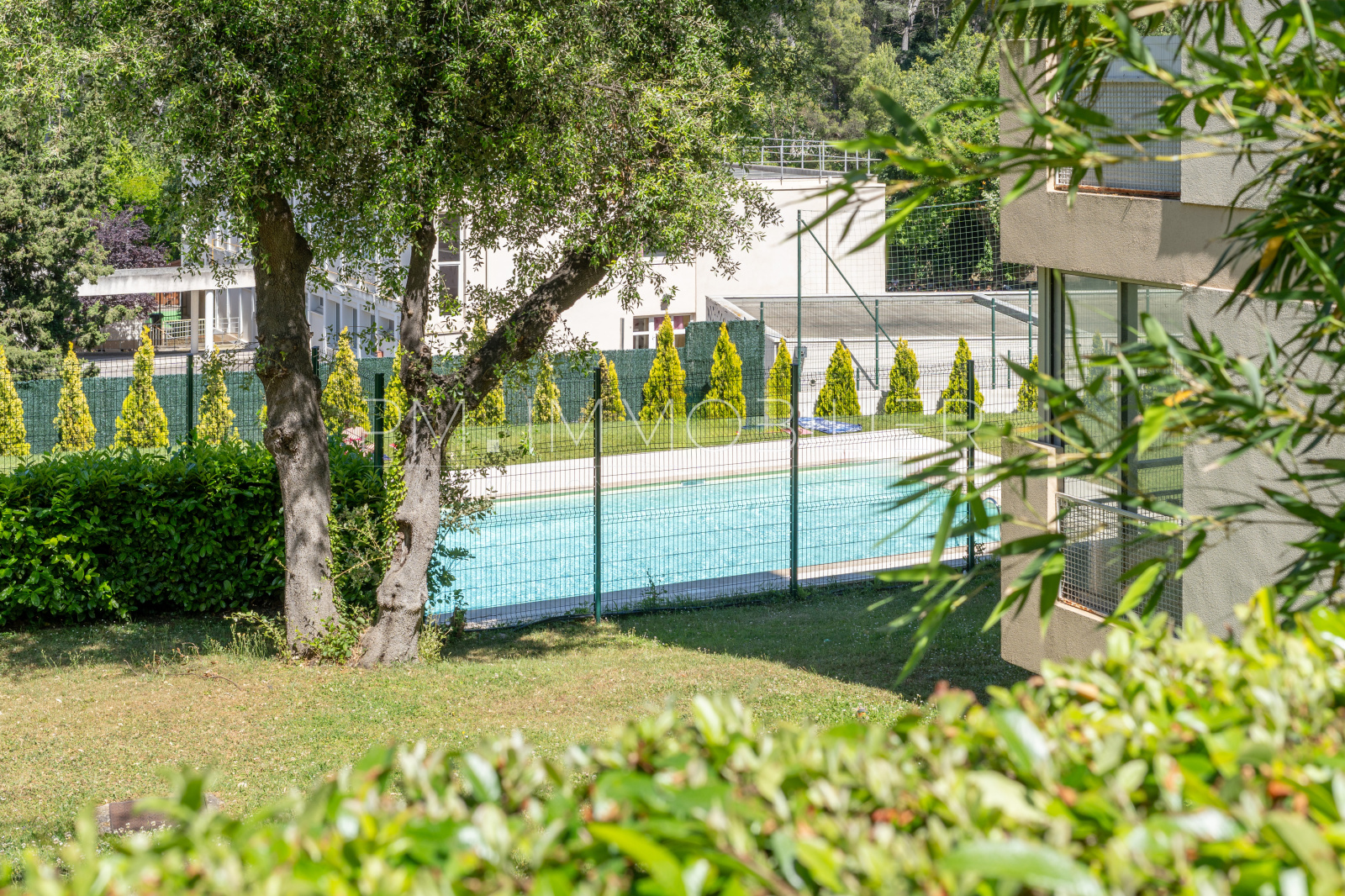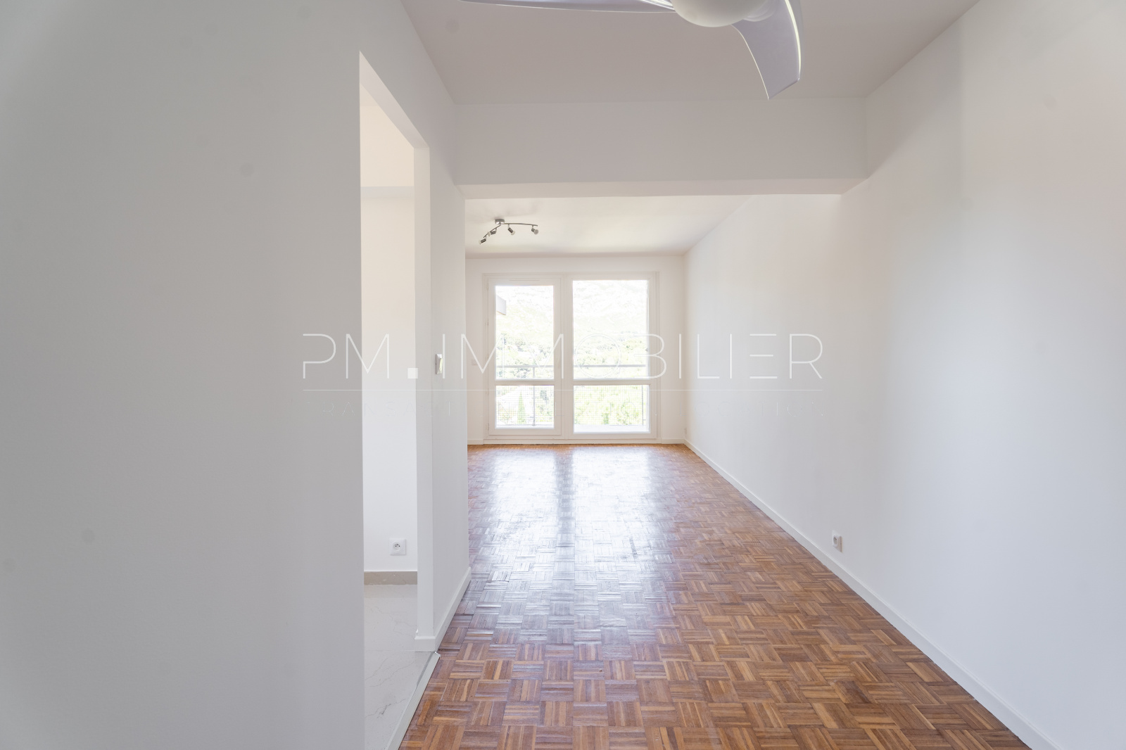 L’appartement se compose d’un séjour lumineux exposé plein Est, ouvrant sur une agréable terrasse avec une vue dégagée sur les collines. La cuisine, semi-ouverte sur la pièce de vie, a été rénovée dans un style sobre et moderne. La chambre est attenante à un grand dressing indépendant. La salle d’eau, également refaite à neuf, dispose d’une douche, d’un meuble vasque avec miroir, d’un sèche-serviettes et d’un WC.