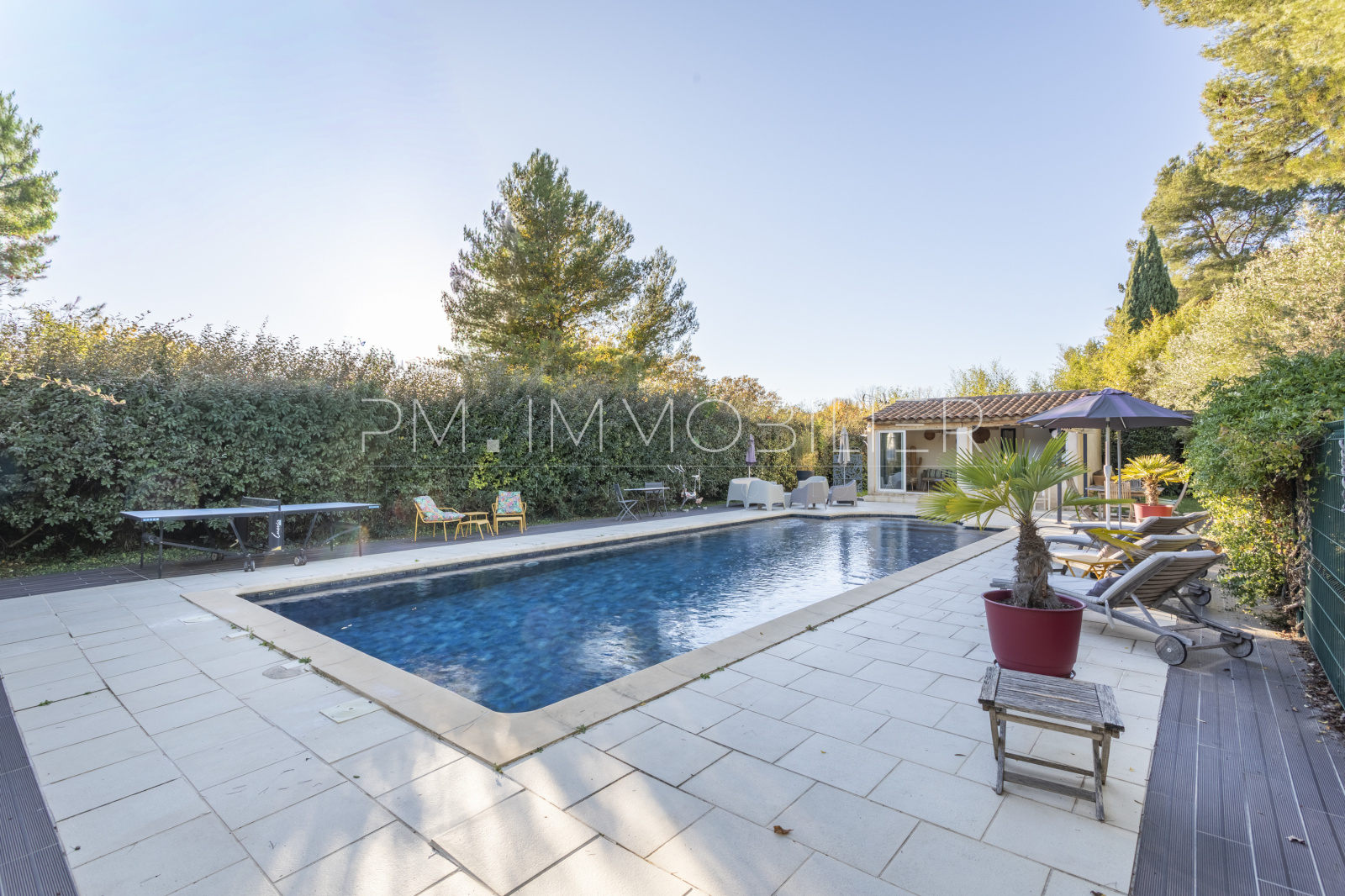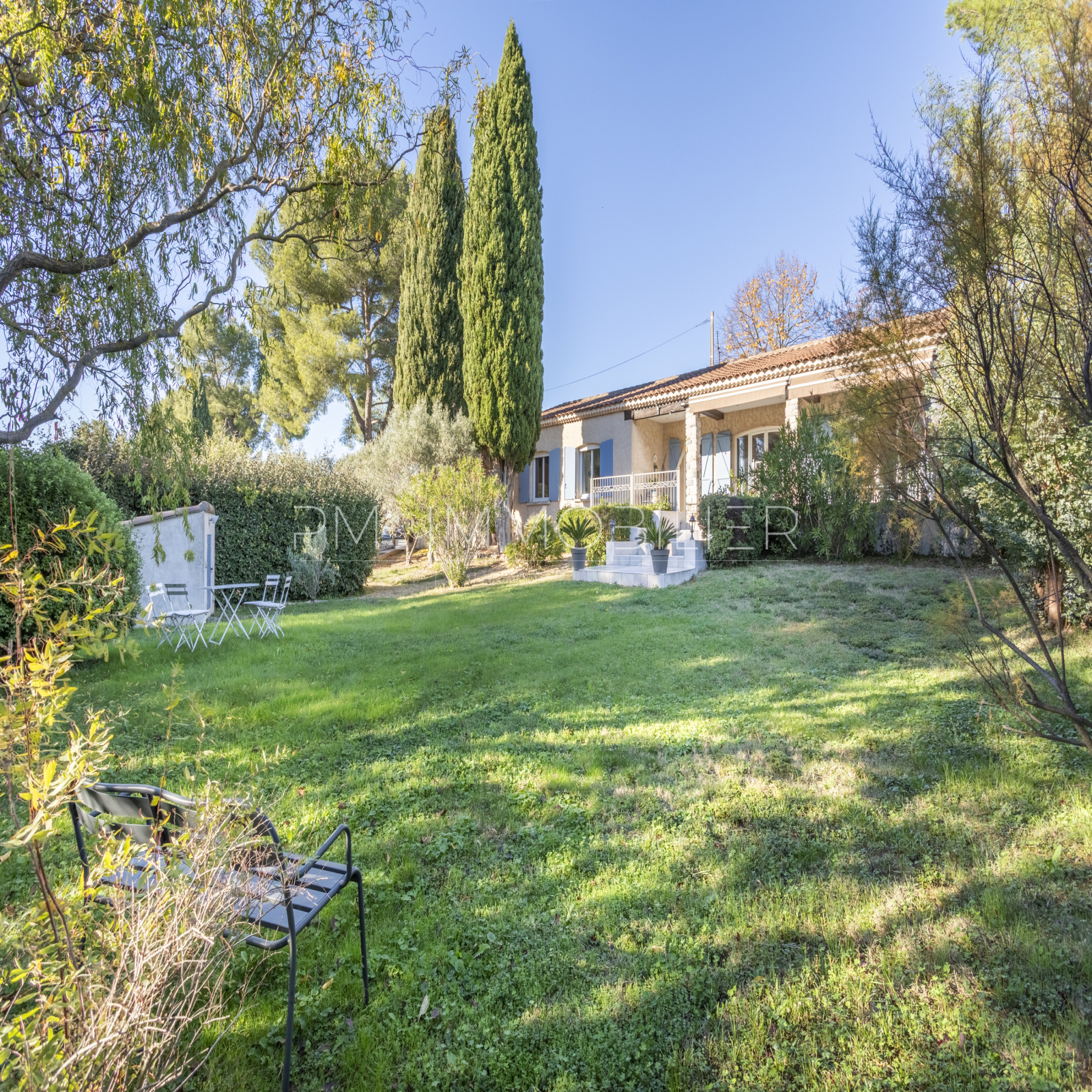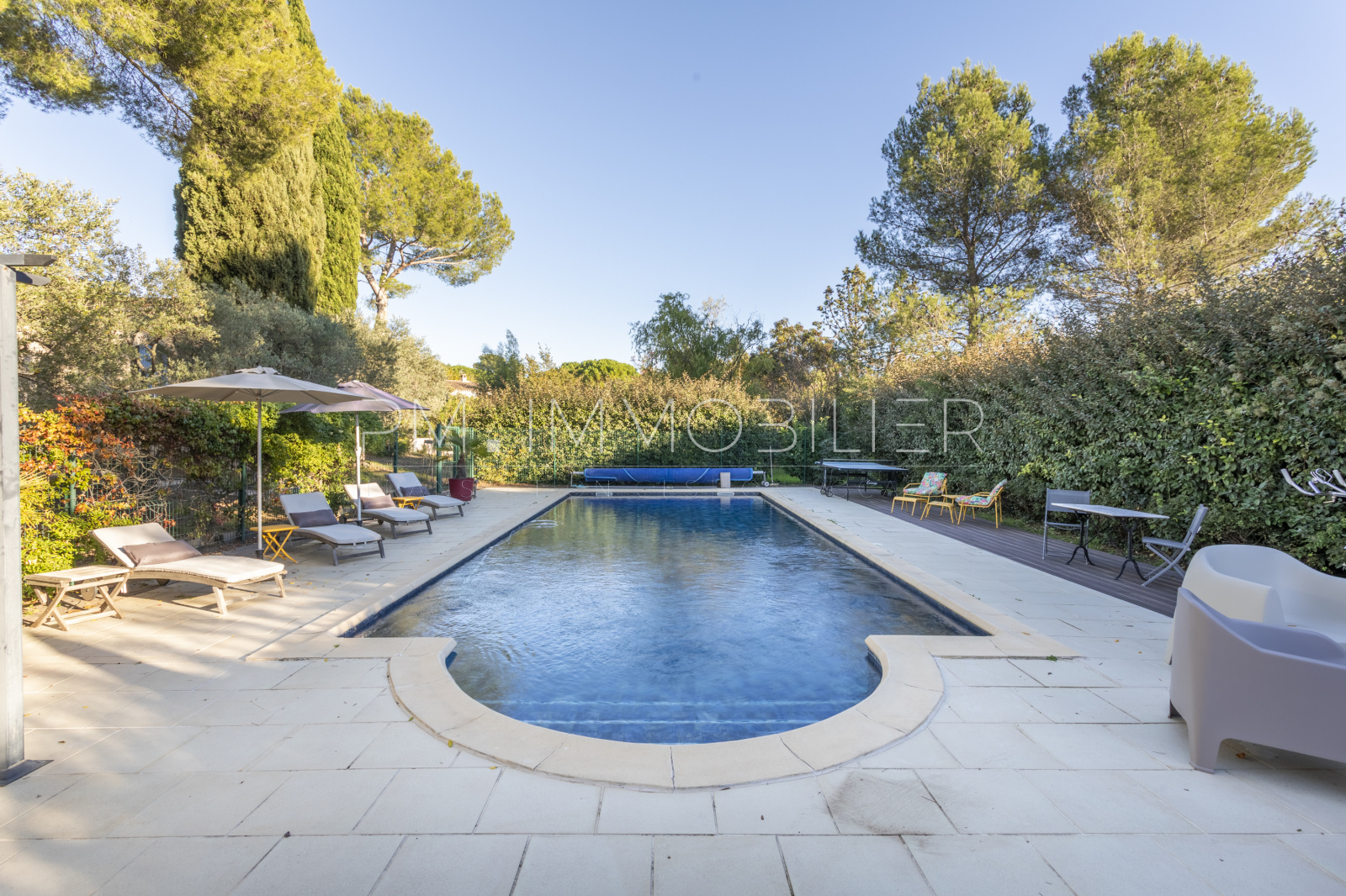 À l’extérieur, la propriété s’épanouit sur 2 200 m² de terrain paysager, clos et soigneusement entretenu : pelouse, massifs méditerranéens, oliviers, arbres d’ornement, zones ombragées et terrain de pétanque composent un ensemble harmonieux et apaisant.