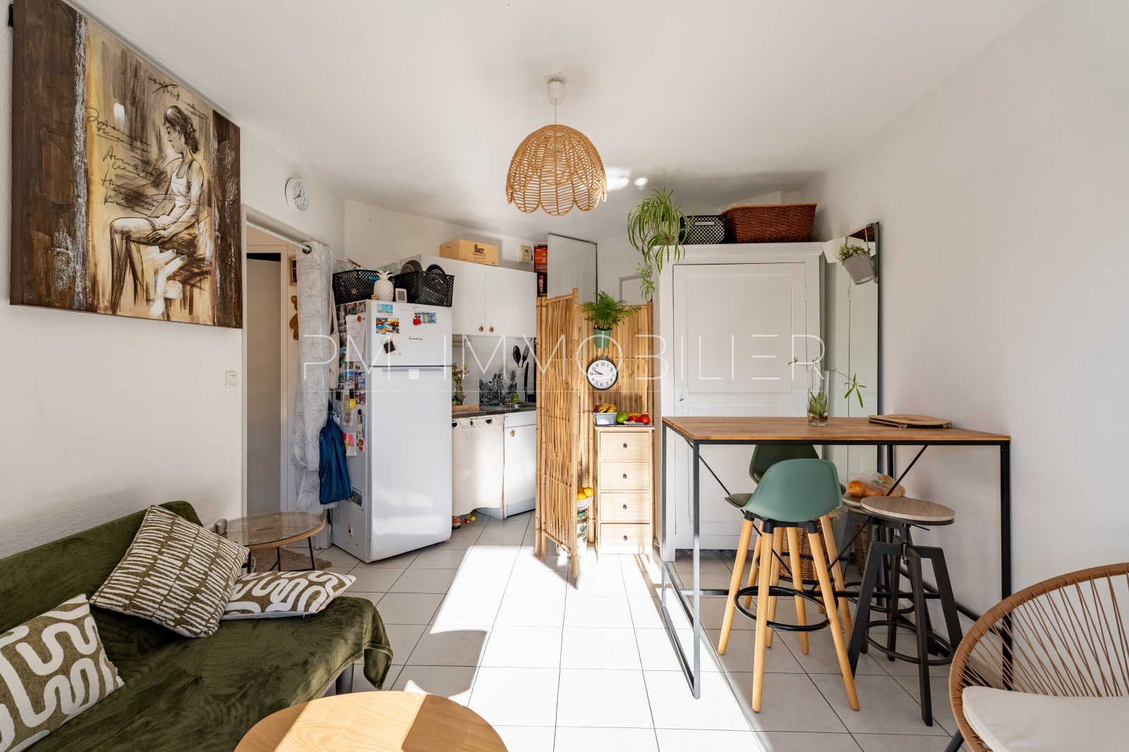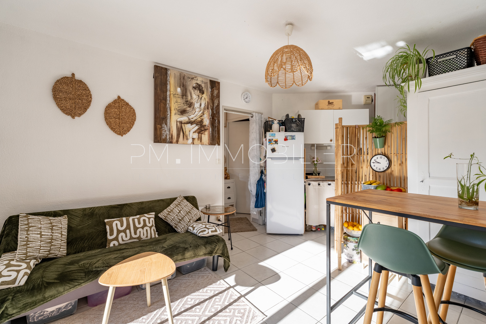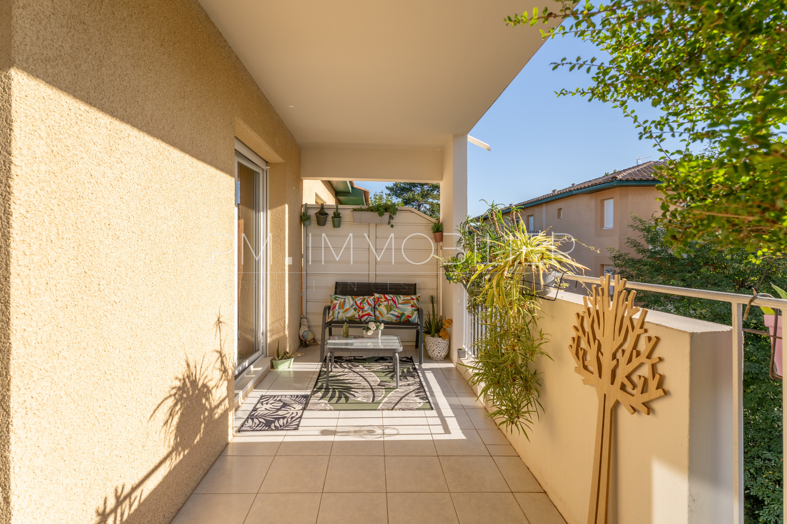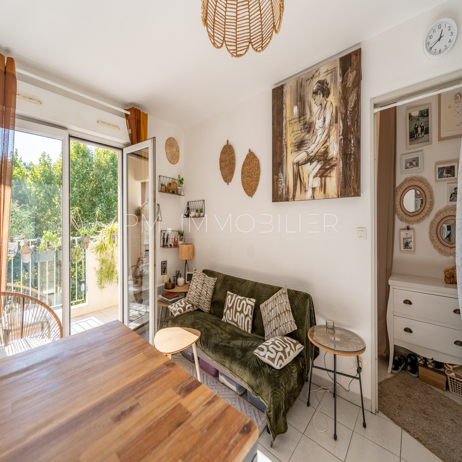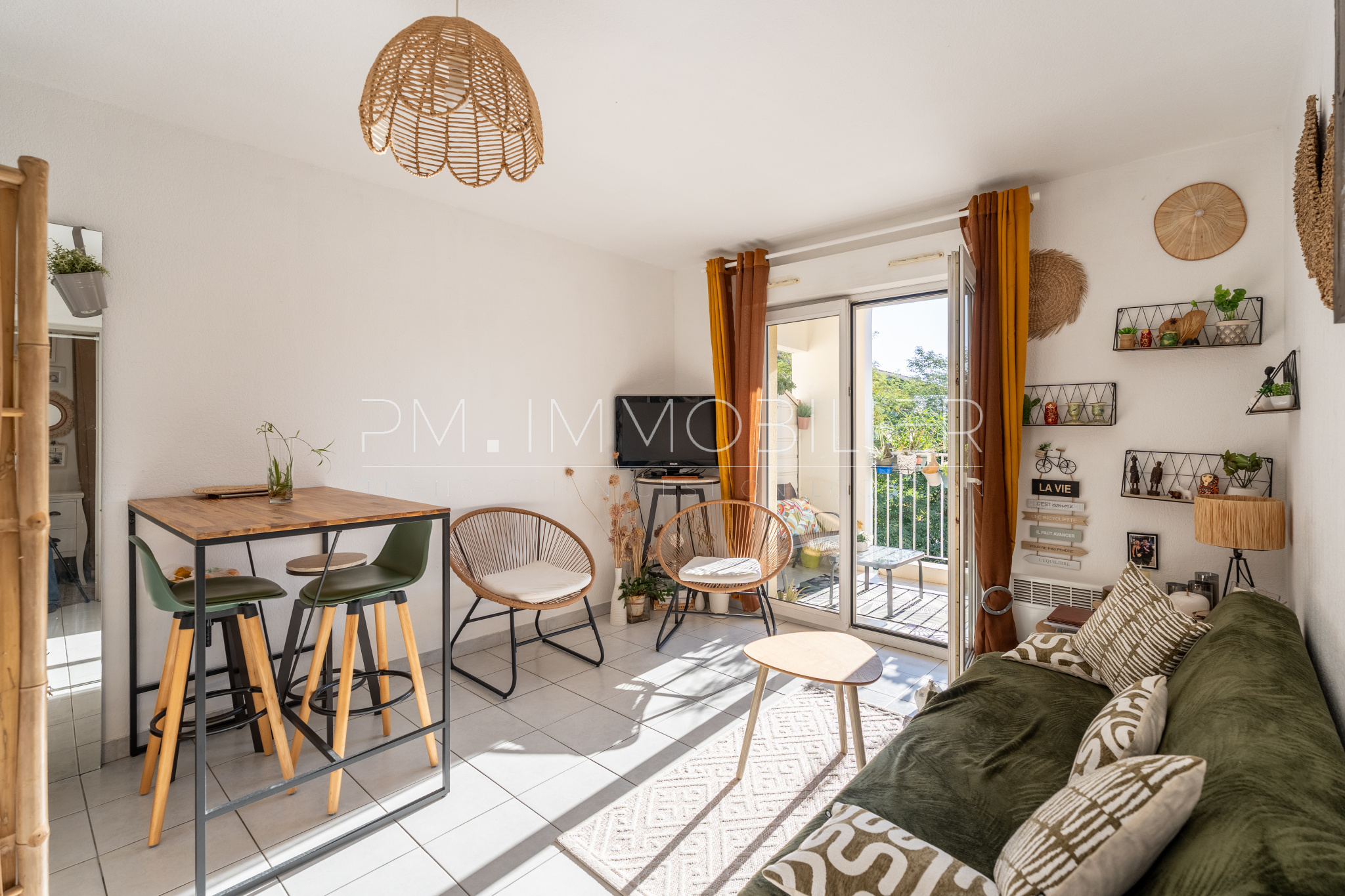 Le séjour, ouvert sur un balcon de 12 m² à la vue dégagée, offre un espace de vie convivial où chaque rayon de soleil vient souligner une décoration soignée aux tons naturels.