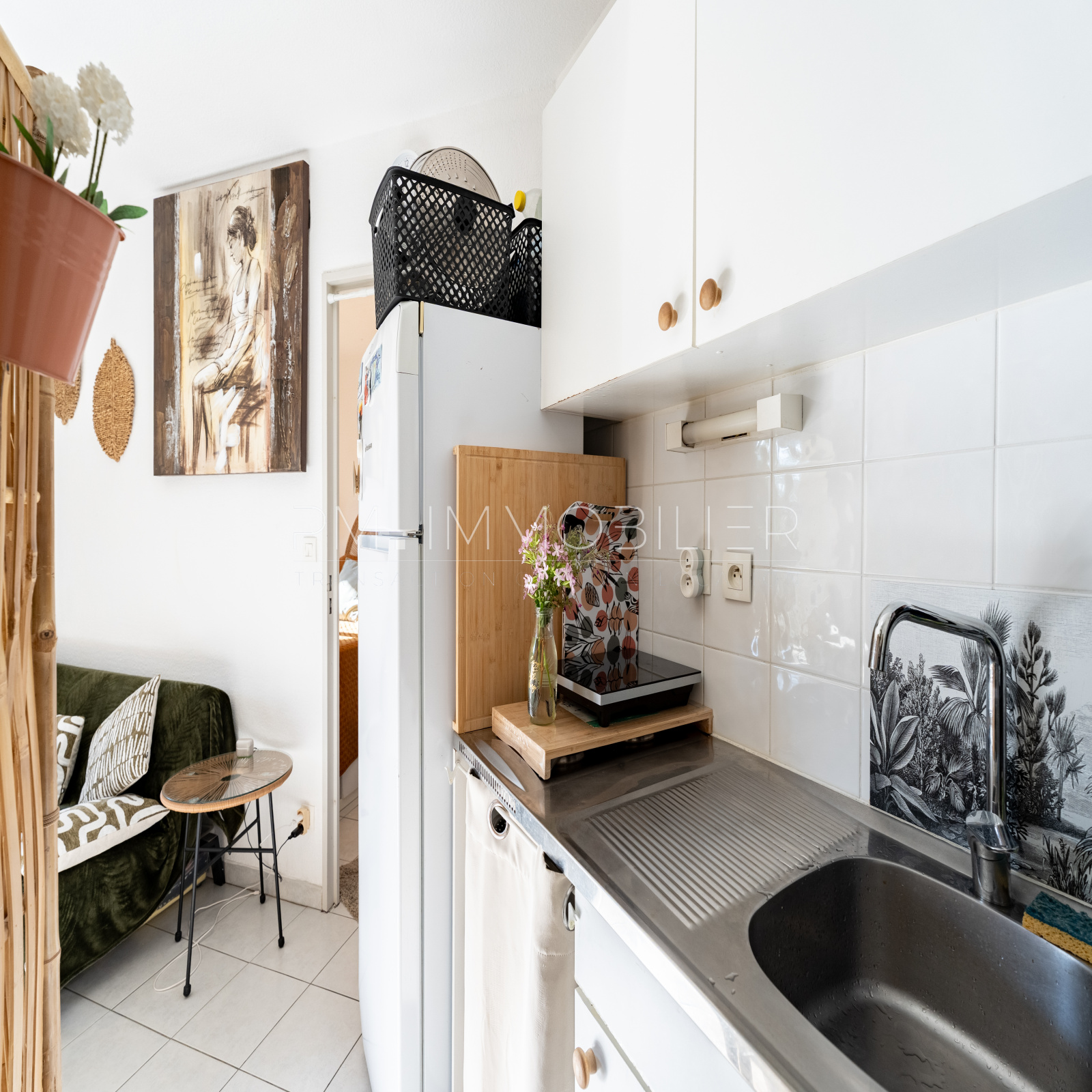 La cuisine ouverte, fonctionnelle et optimisée, s’intègre harmonieusement à la pièce principale.