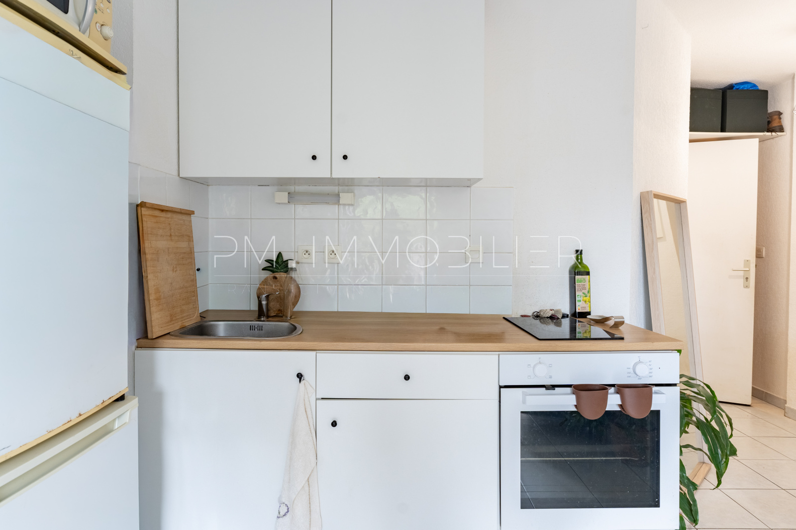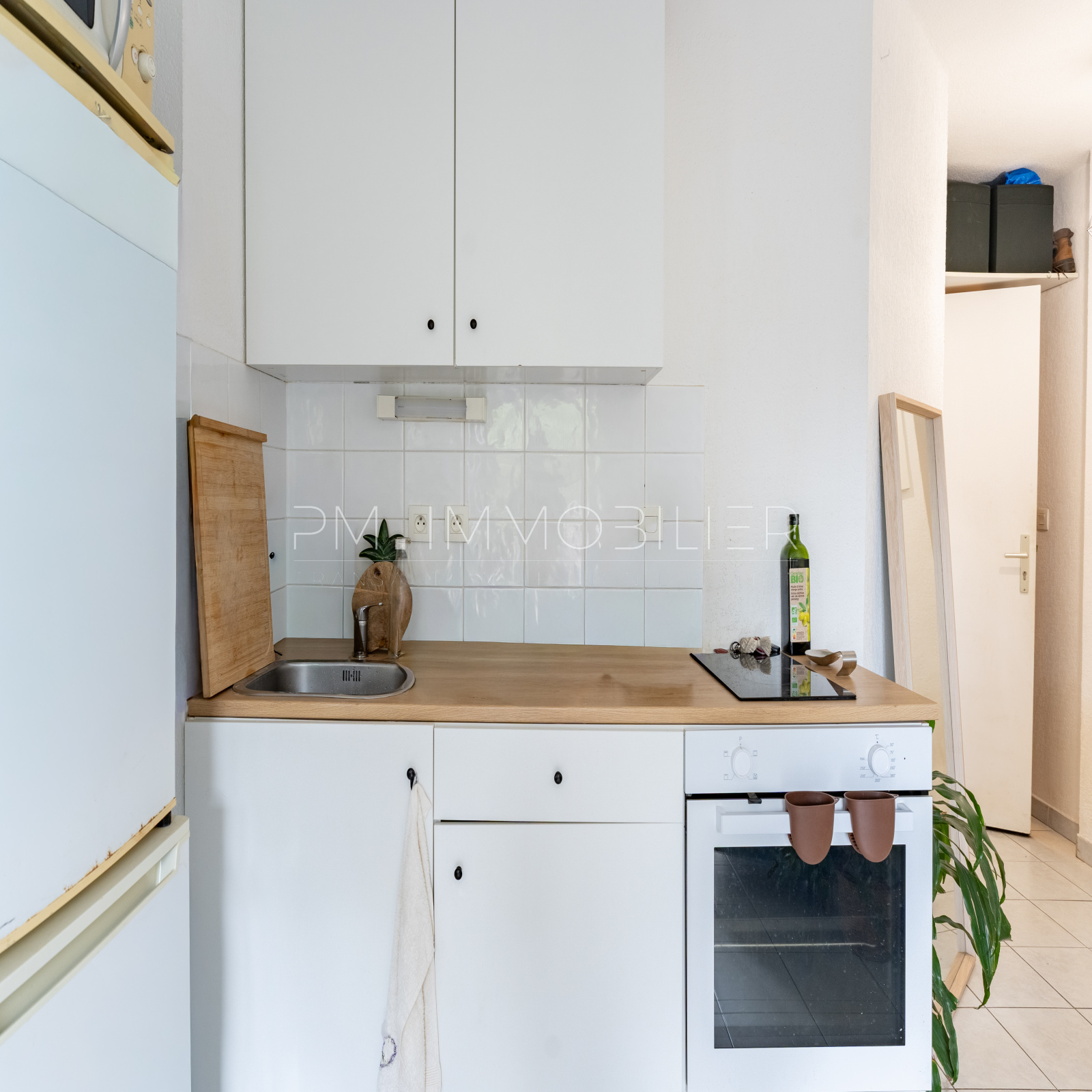 La cuisine ouverte, fonctionnelle et optimisée, s’intègre harmonieusement à la pièce principale.