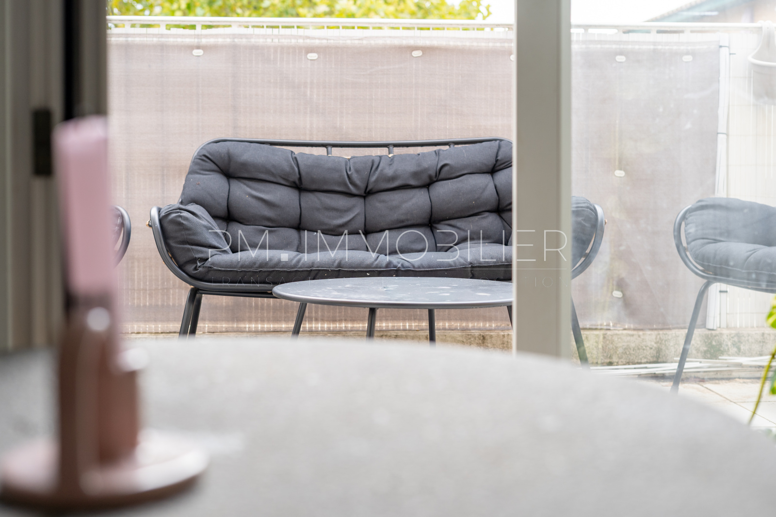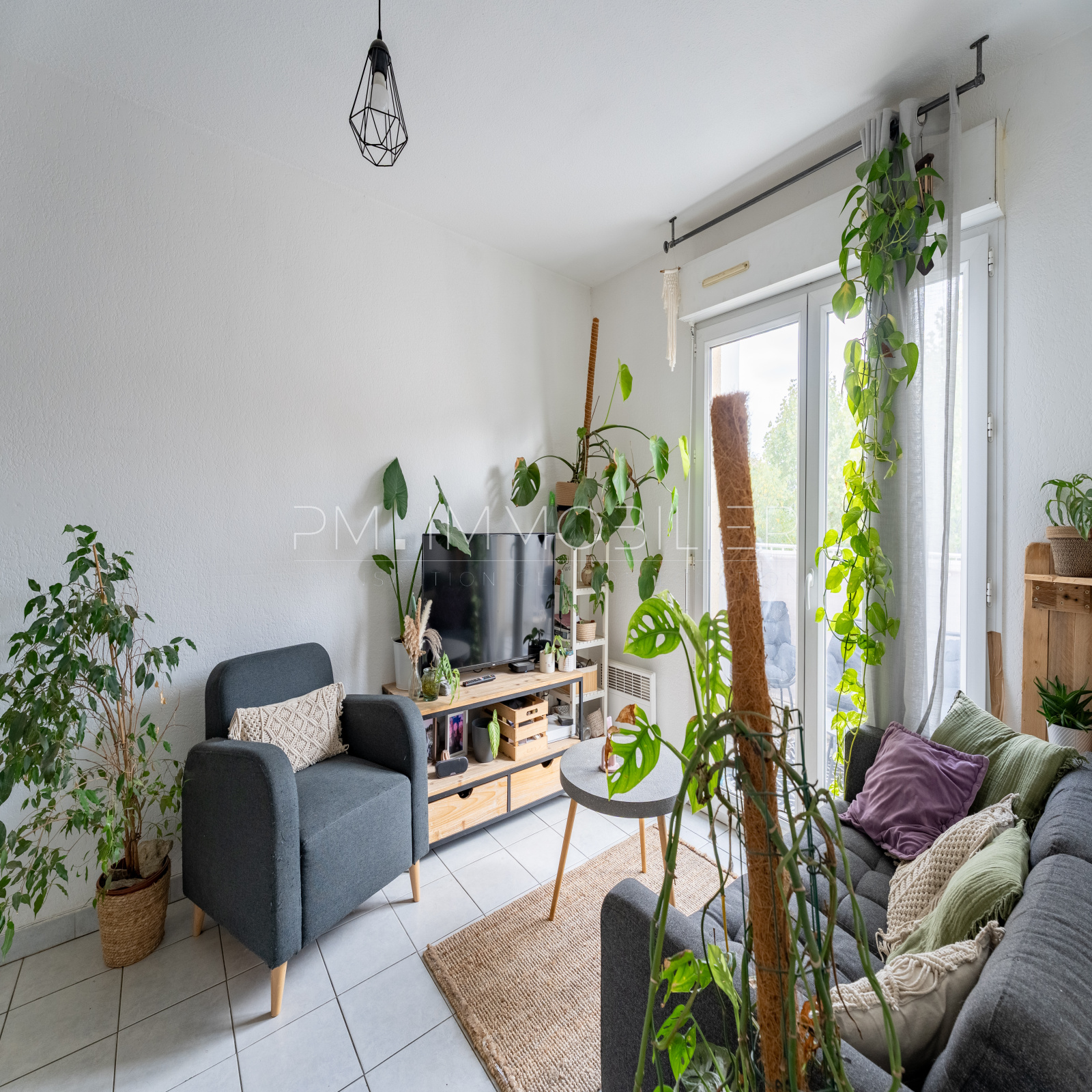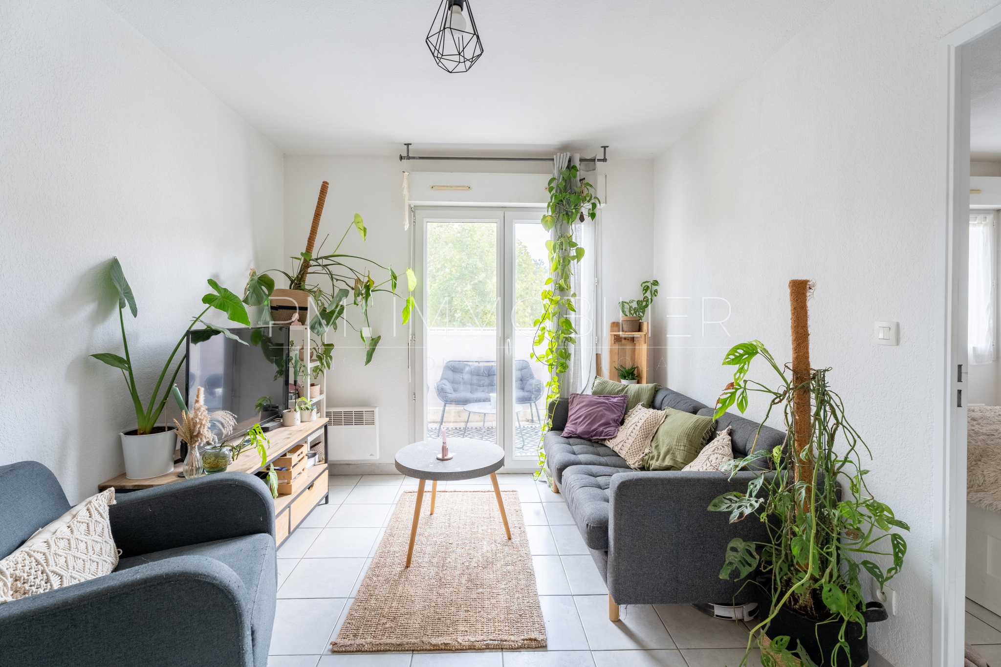 Le séjour, ouvert sur un balcon de 8 m² à la vue dégagée, offre un espace de vie convivial où chaque rayon de soleil vient souligner une décoration soignée aux tons naturels.