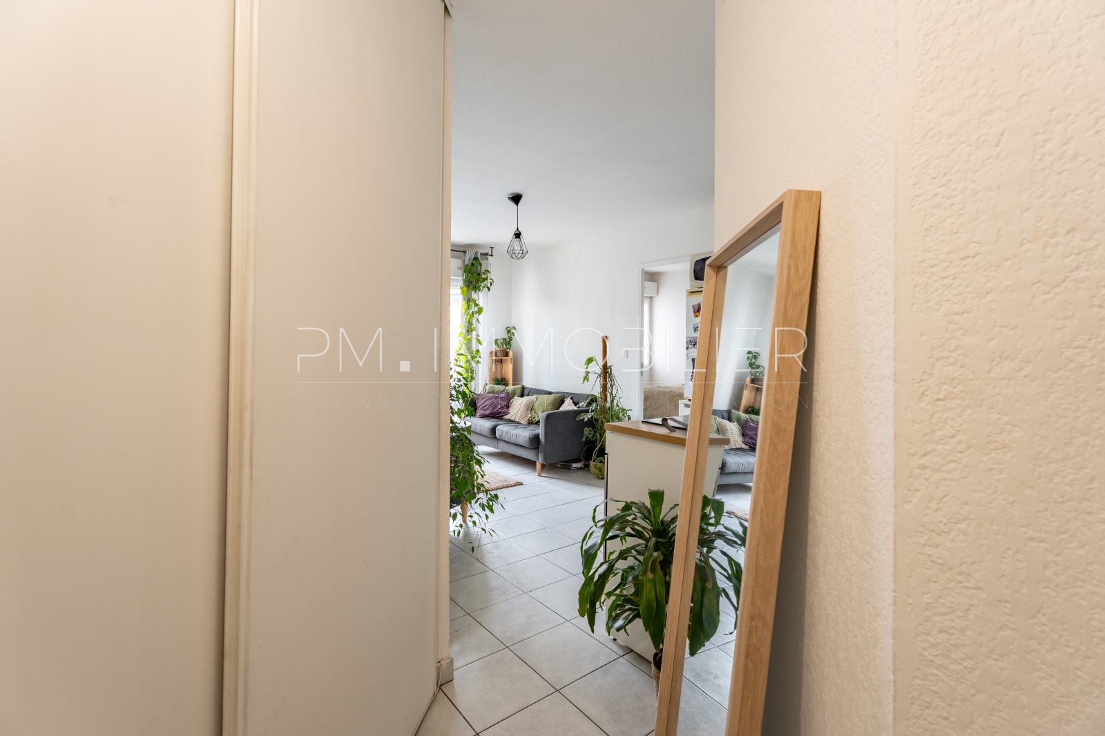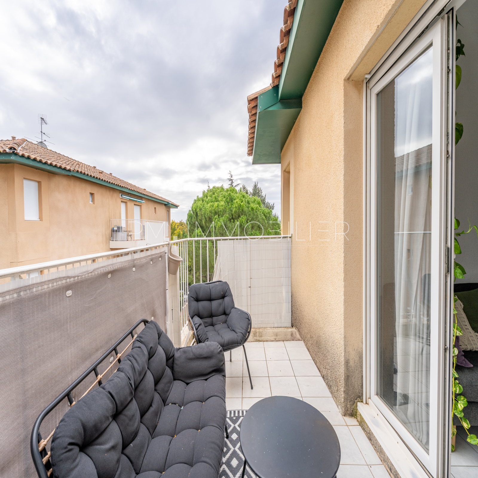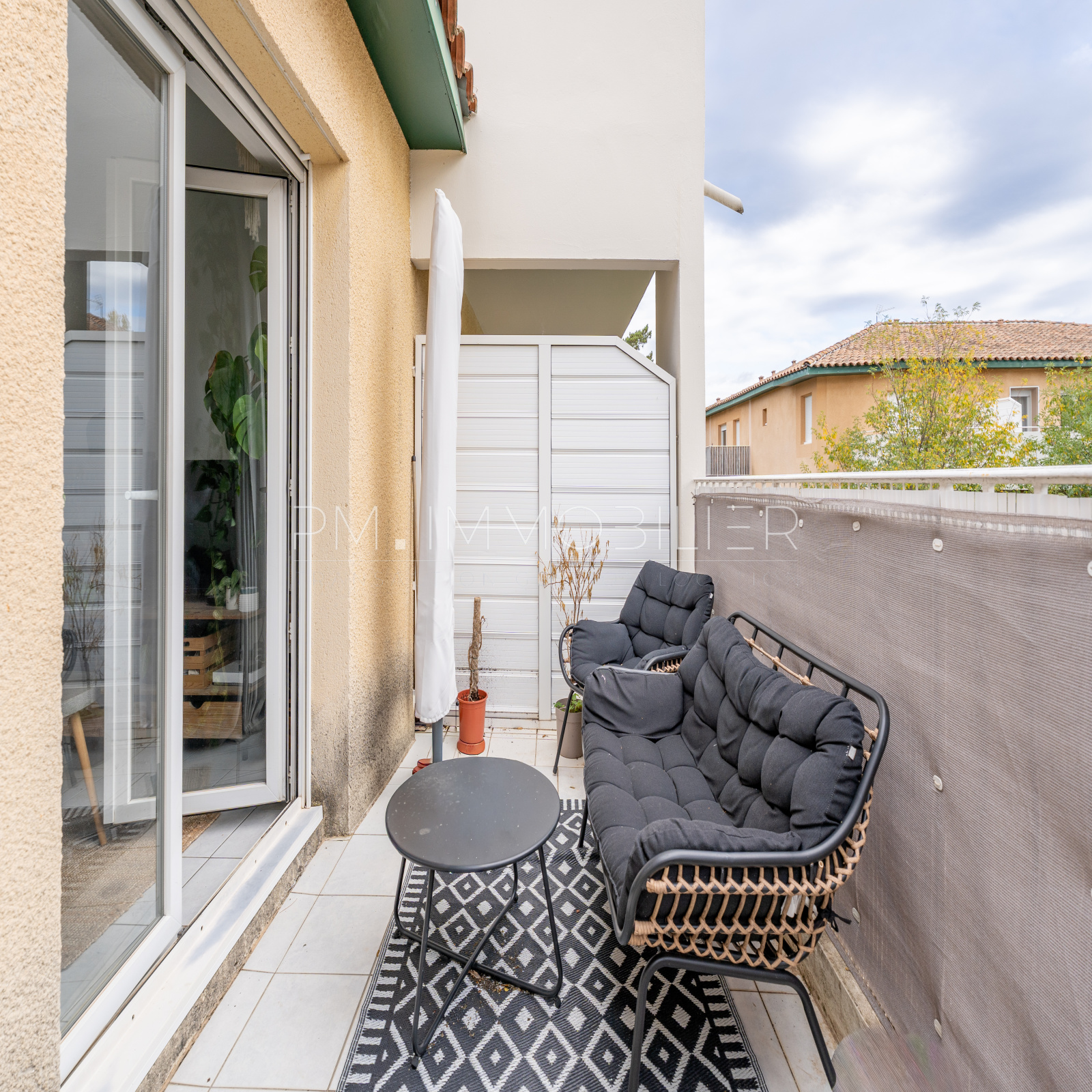 Le séjour, ouvert sur un balcon de 8 m² à la vue dégagée, offre un espace de vie convivial où chaque rayon de soleil vient souligner une décoration soignée aux tons naturels.