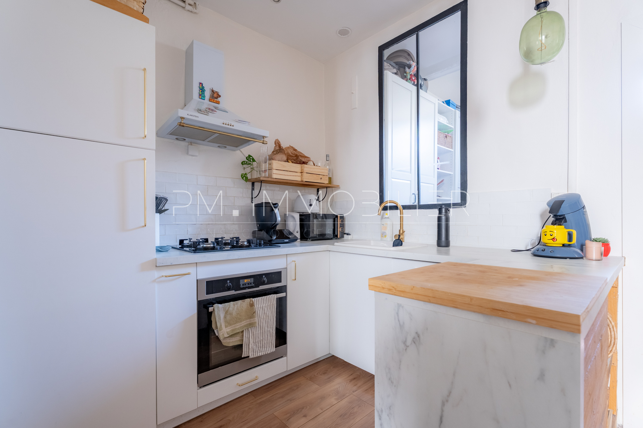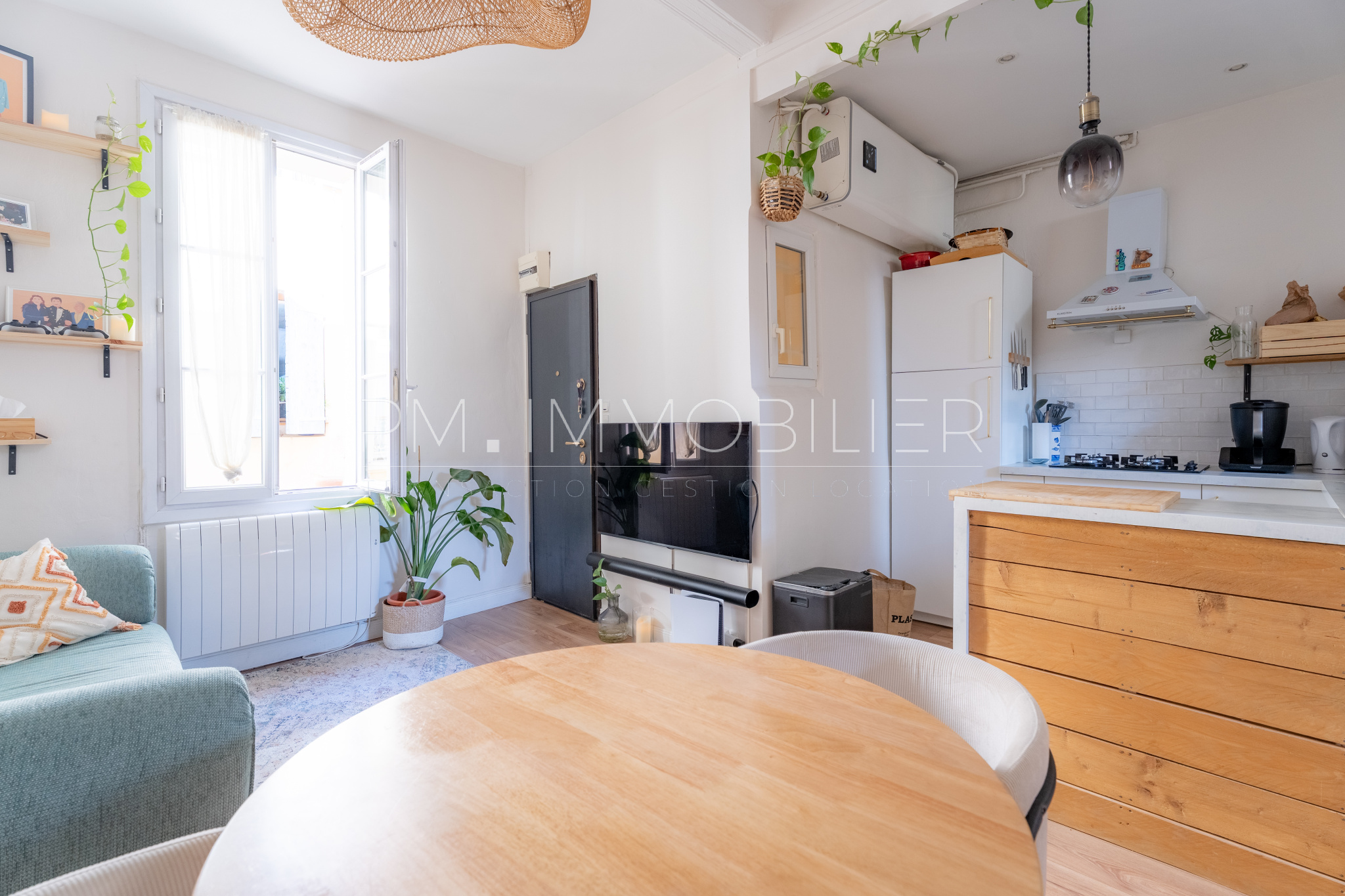 Dès l’entrée, le ton est donné avec une rénovation soignée mêlant matériaux contemporains et cachet de l’ancien. Le séjour, baigné de lumière, s’organise autour d’une cuisine ouverte élégante, structurée par un îlot central aux finitions bois et marbre, créant un espace de vie convivial et parfaitement optimisé.