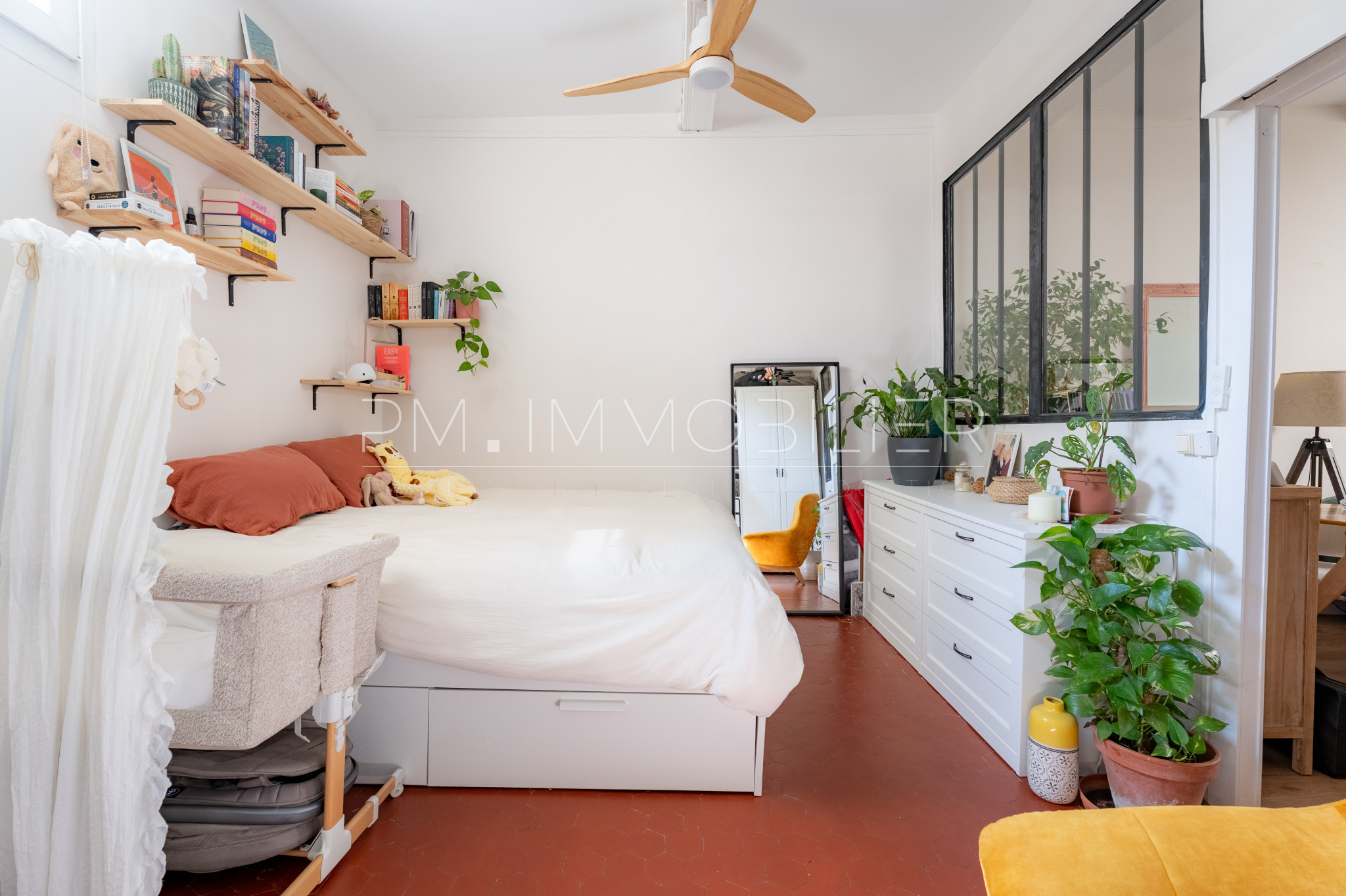Les volumes sont agréables, sublimés par une belle hauteur sous plafond et une circulation fluide entre les espaces. La chambre, spacieuse et chaleureuse, offre un véritable cocon, prolongé par une salle d’eau moderne aux lignes épurées.