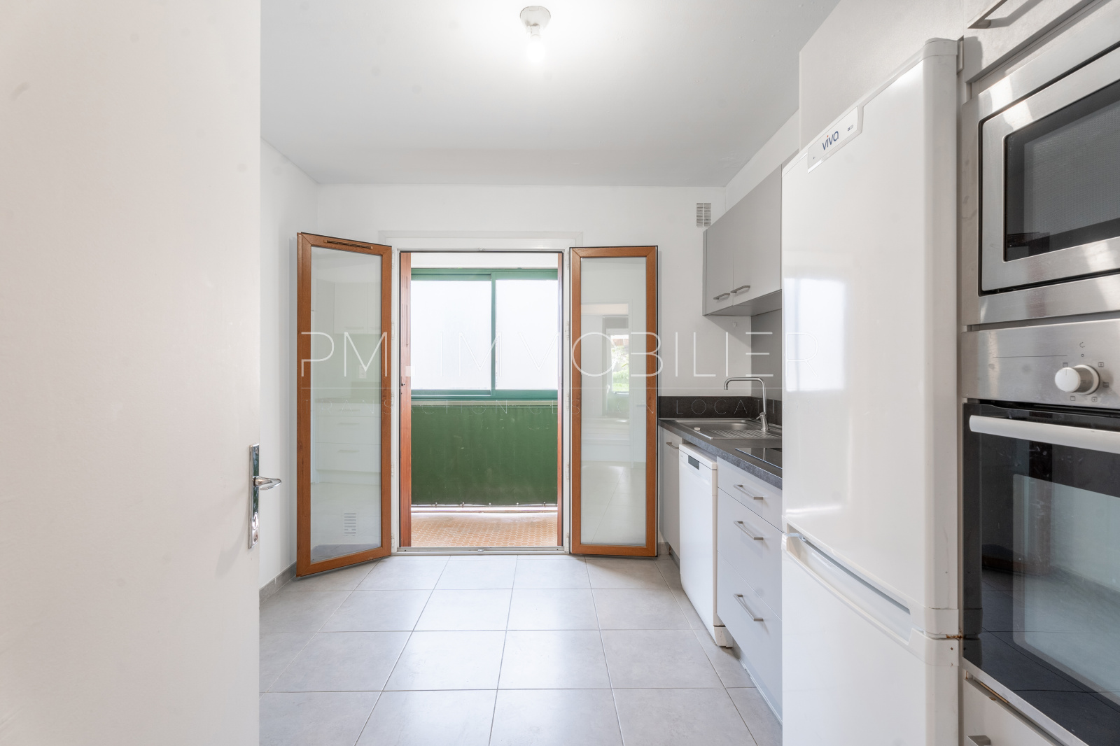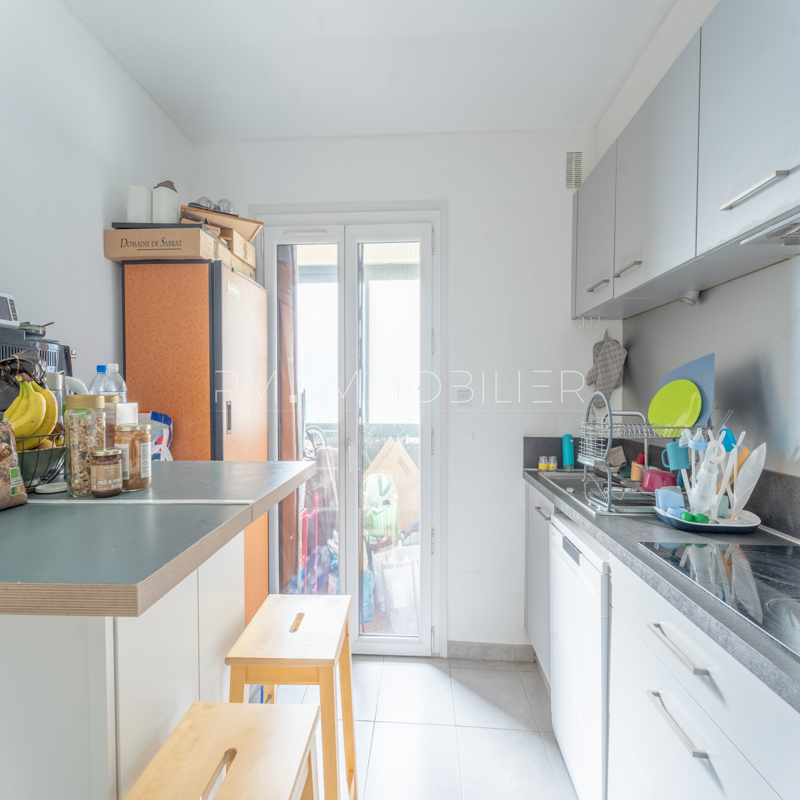On retrouve une cuisine fermée, équipée et fonctionnelle avec un accès également à l'espace extérieur.