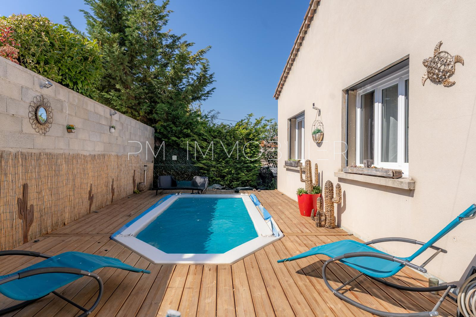À l’extérieur, la maison se prolonge naturellement avec une vaste terrasse dédiée aux repas d’été, un jardin agréable et une piscine intégrée dans un cadre intimiste, propice à la détente.