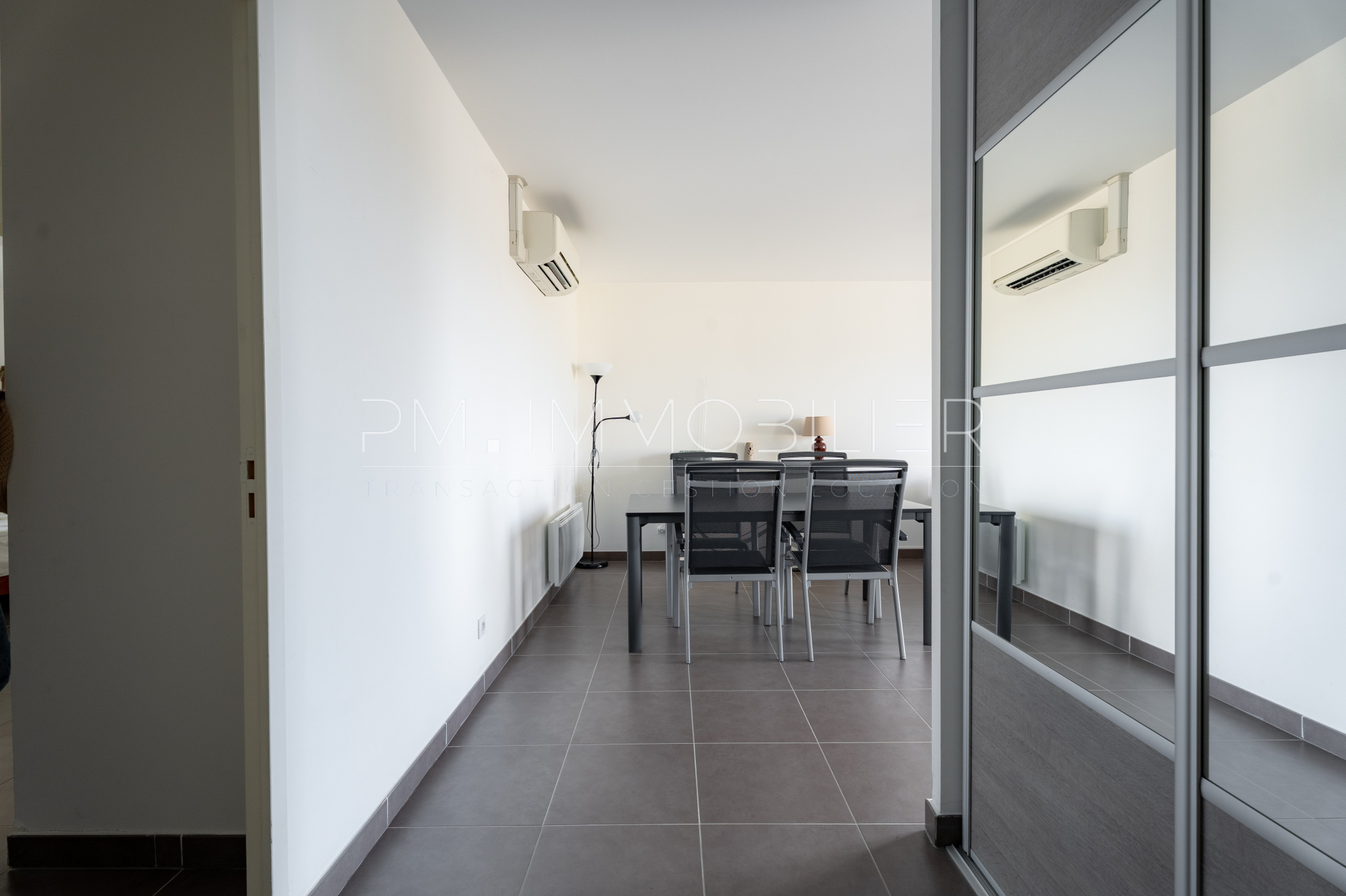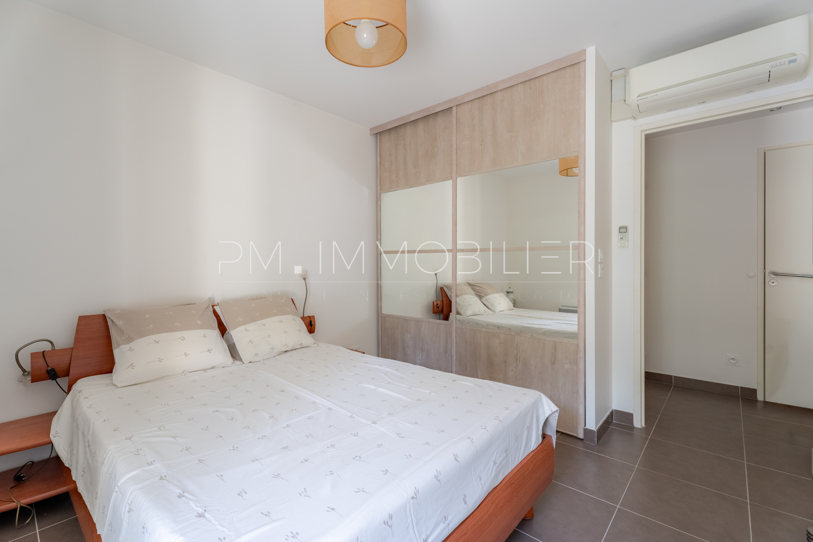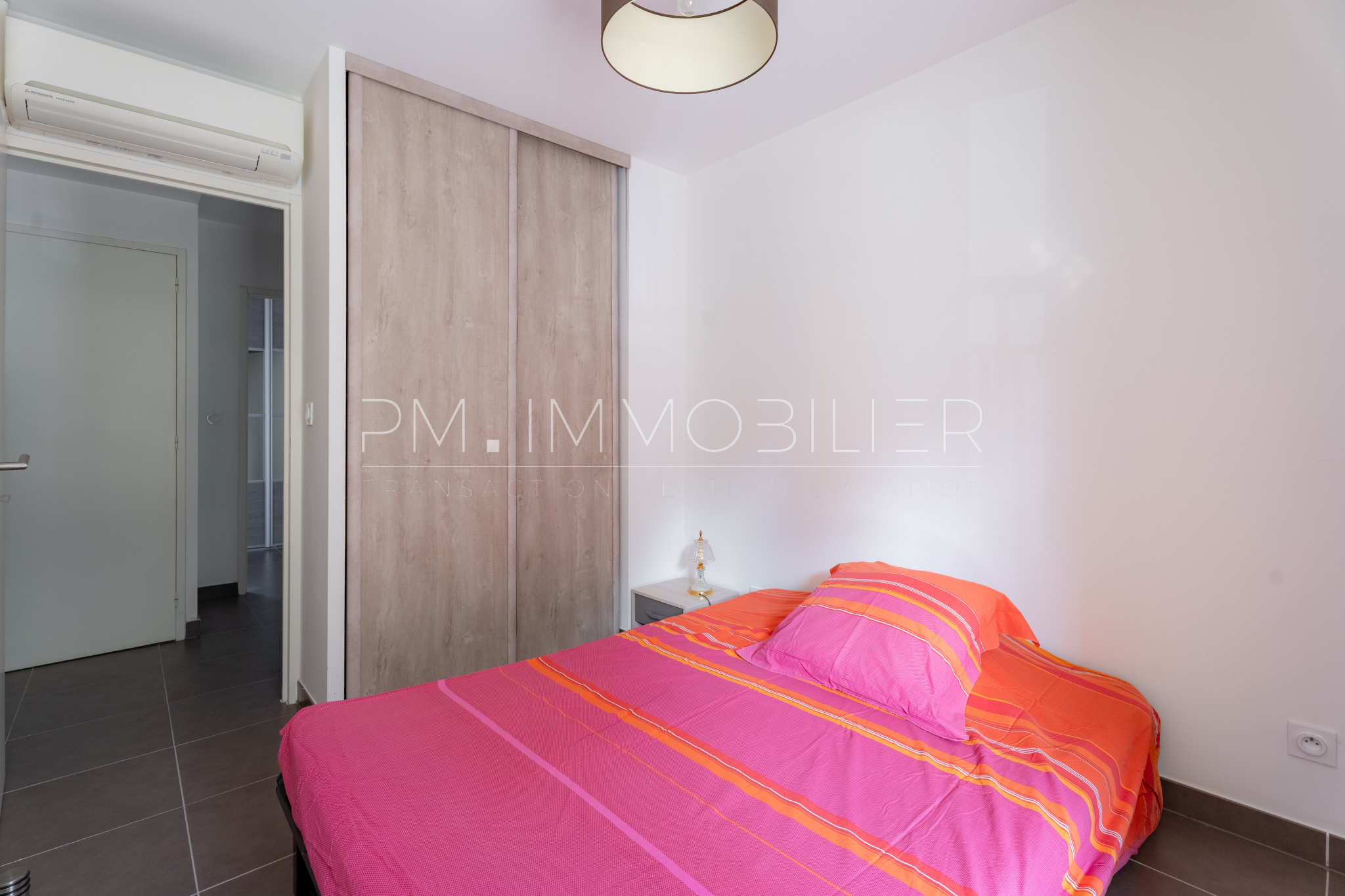 Dès l’entrée, un grand dressing apporte un espace de rangement confortable et fonctionnel. La pièce de vie, agréable et conviviale, se compose d’un salon avec cuisine ouverte entièrement équipée, bénéficiant d’un accès direct à la terrasse, véritable prolongement de l’espace intérieur. L’appartement est entièrement climatisé, garantissant un confort optimal en toute saison.