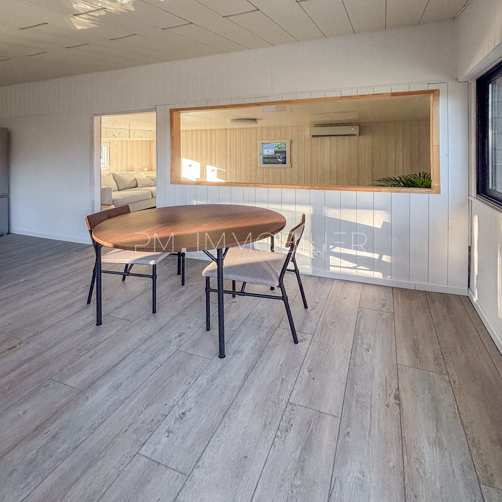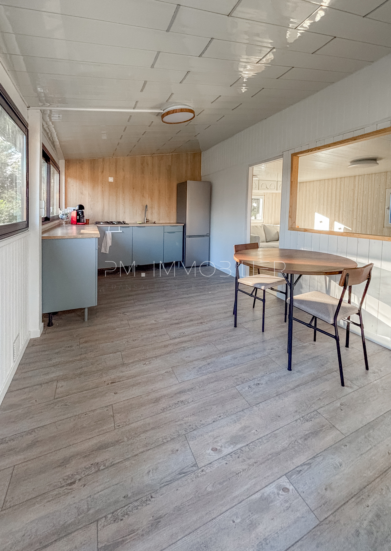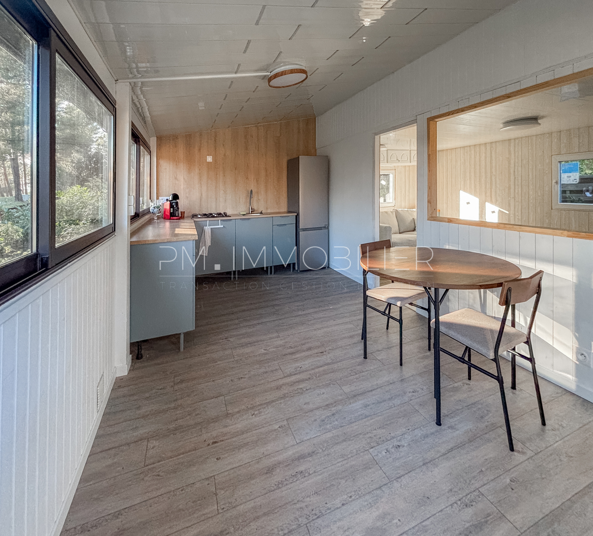 Ce Mobil home chalet se compose d’une grande pièce de vie lumineuse, bénéficiant de nombreuses ouvertures donnant sur le jardin. L’espace salon et salle à manger est confortable, climatisé et permet plusieurs aménagements. La cuisine entièrement rénovée, moderne et fonctionnelle, offre de beaux plans de travail et de nombreux rangements.