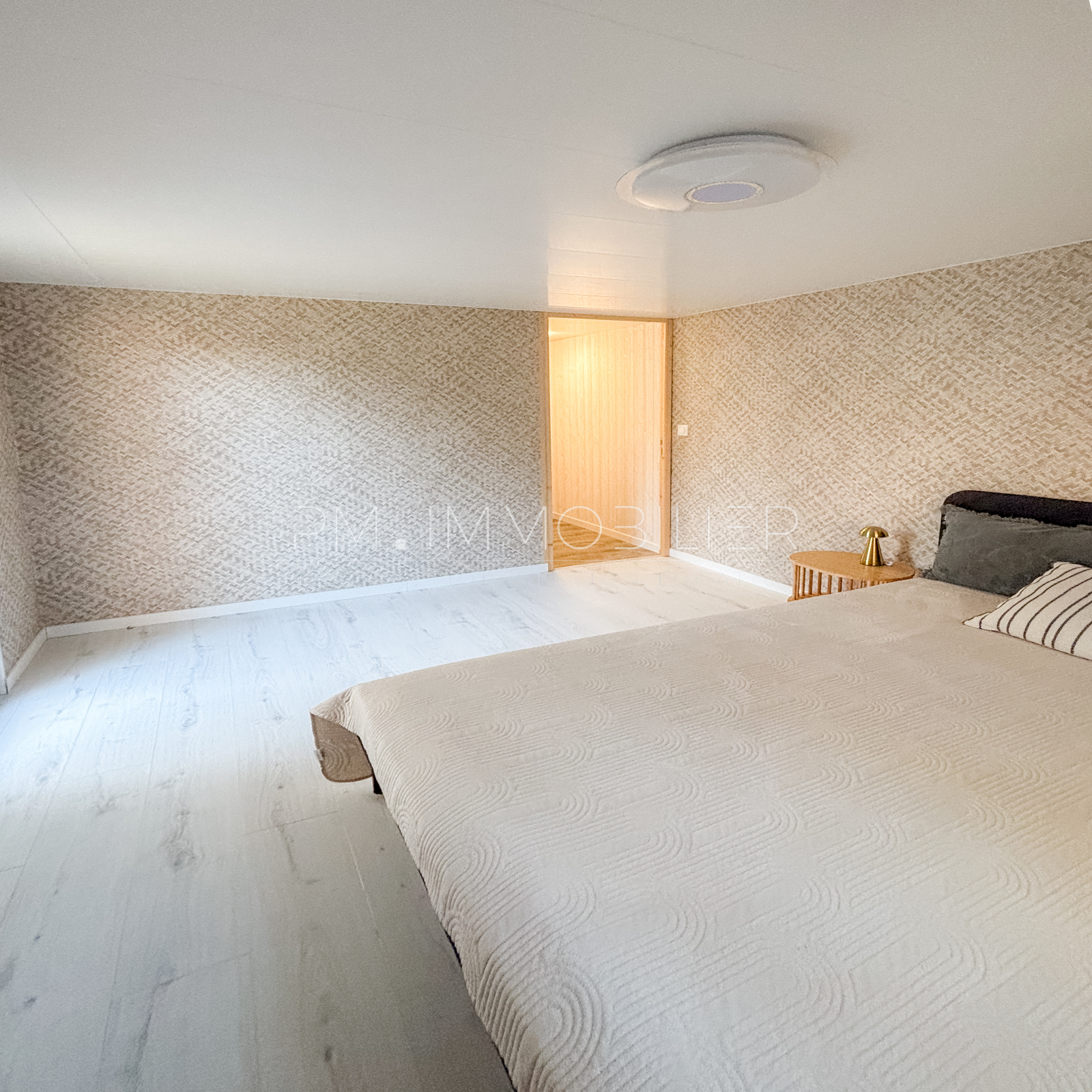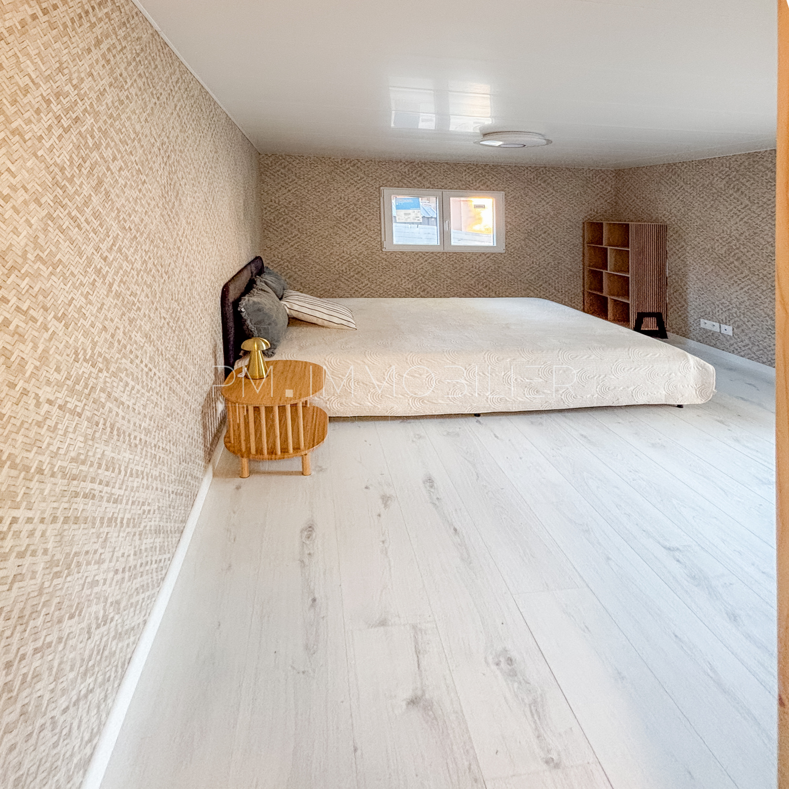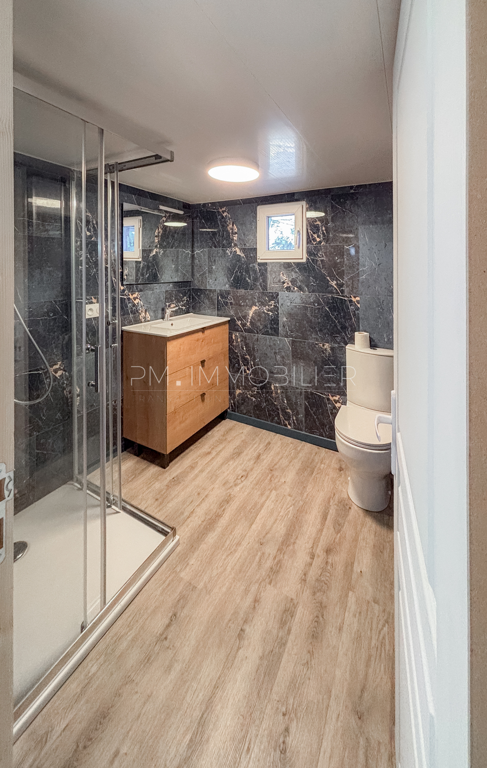 La partie nuit comprend une chambre spacieuse, dotée d’un placard et d’un mur en lames bois décoratives apportant une touche chaleureuse. Une salle d’eau moderne, avec douche, meuble vasque et WC , complète l’ensemble. Les volumes sont optimisés et l’ensemble du chalet bénéficie d’un sol uniforme, donnant une sensation de clarté et d’espace.