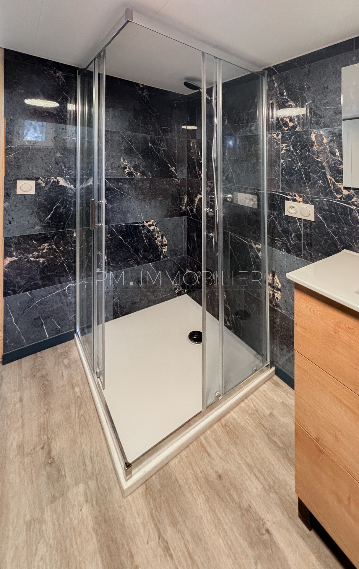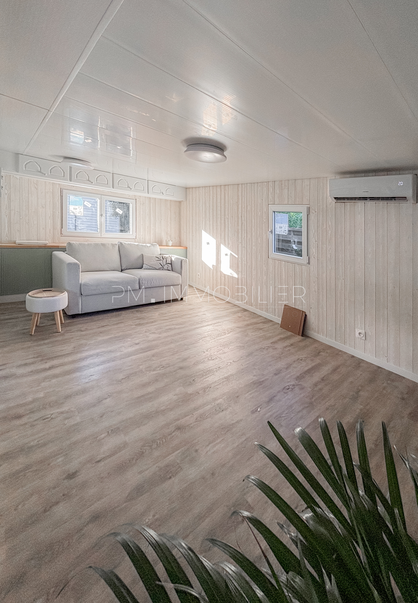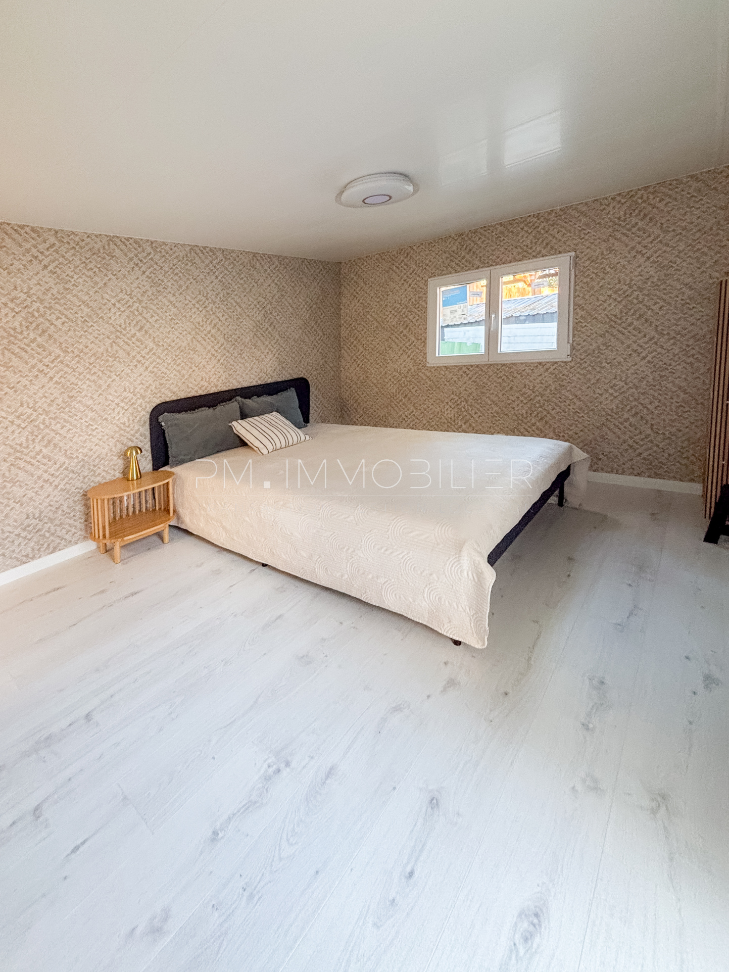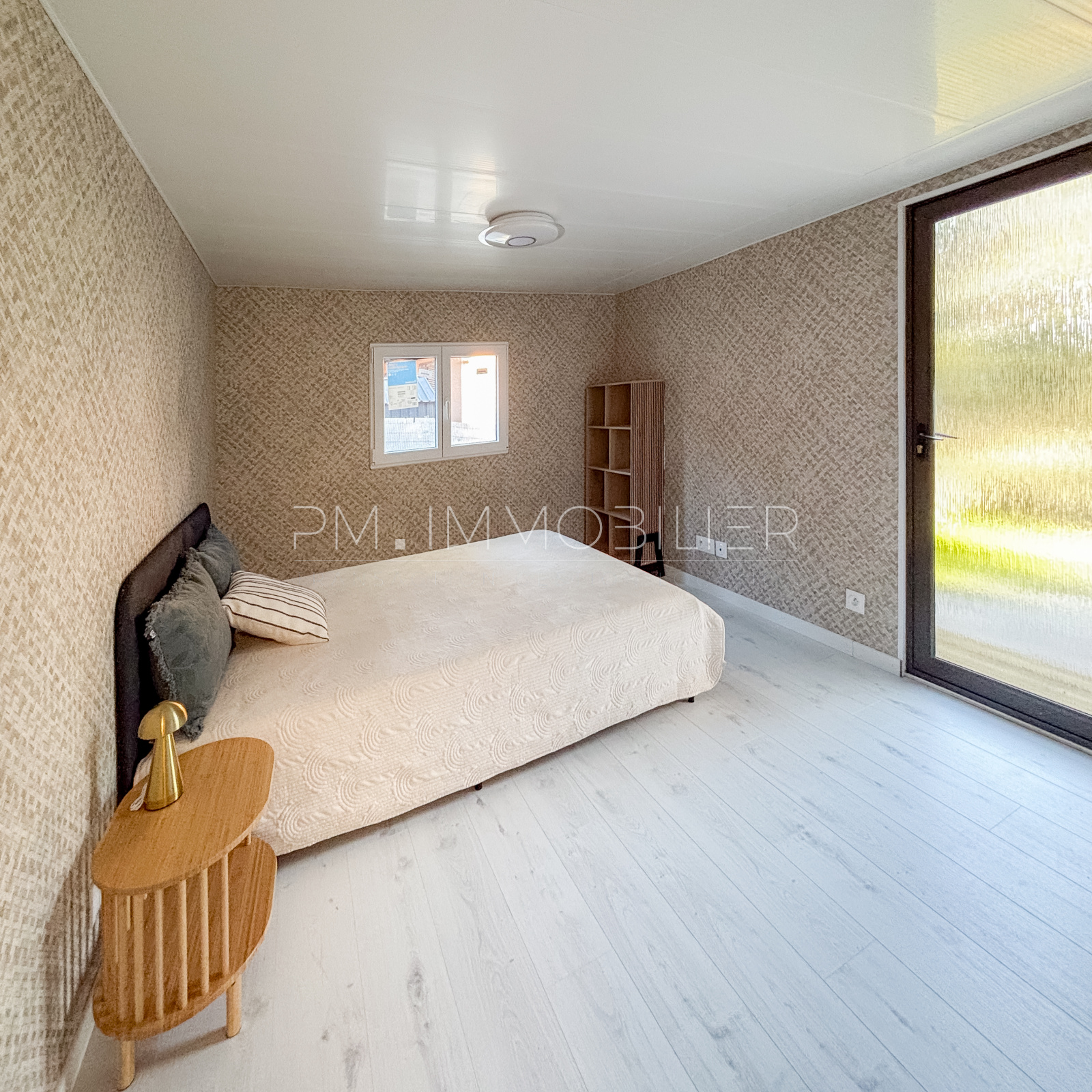 La partie nuit comprend une chambre spacieuse, dotée d’un placard et d’un mur en lames bois décoratives apportant une touche chaleureuse. Une salle d’eau moderne, avec douche, meuble vasque et WC , complète l’ensemble. Les volumes sont optimisés et l’ensemble du chalet bénéficie d’un sol uniforme, donnant une sensation de clarté et d’espace.