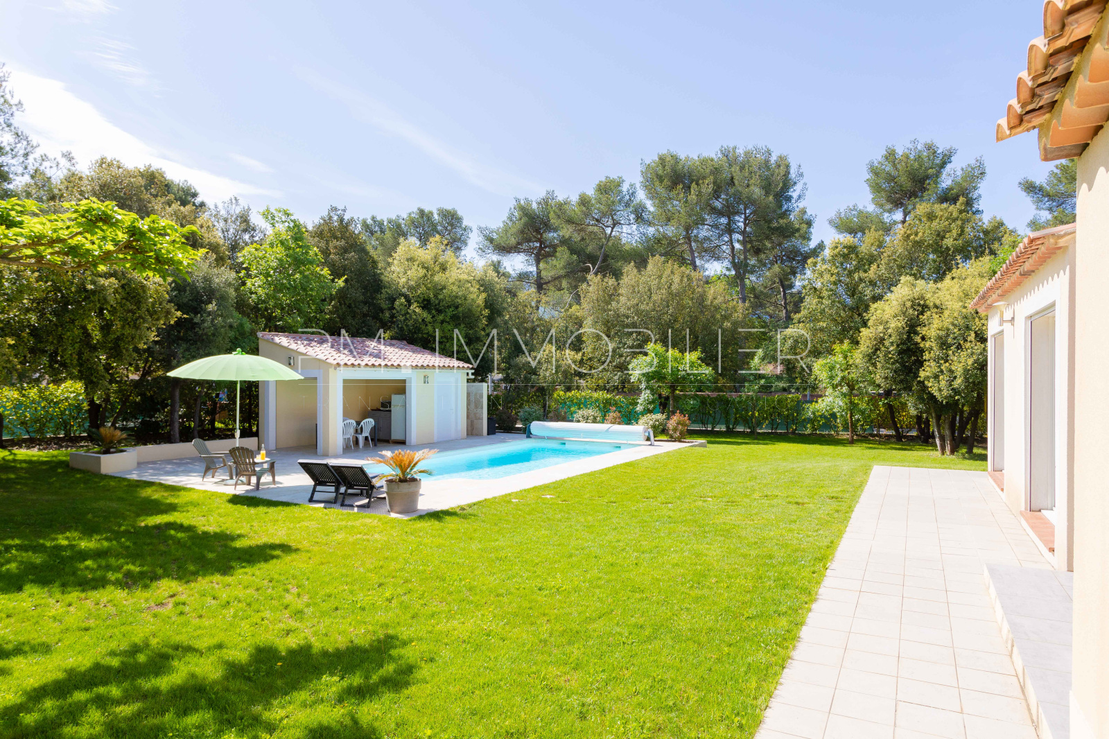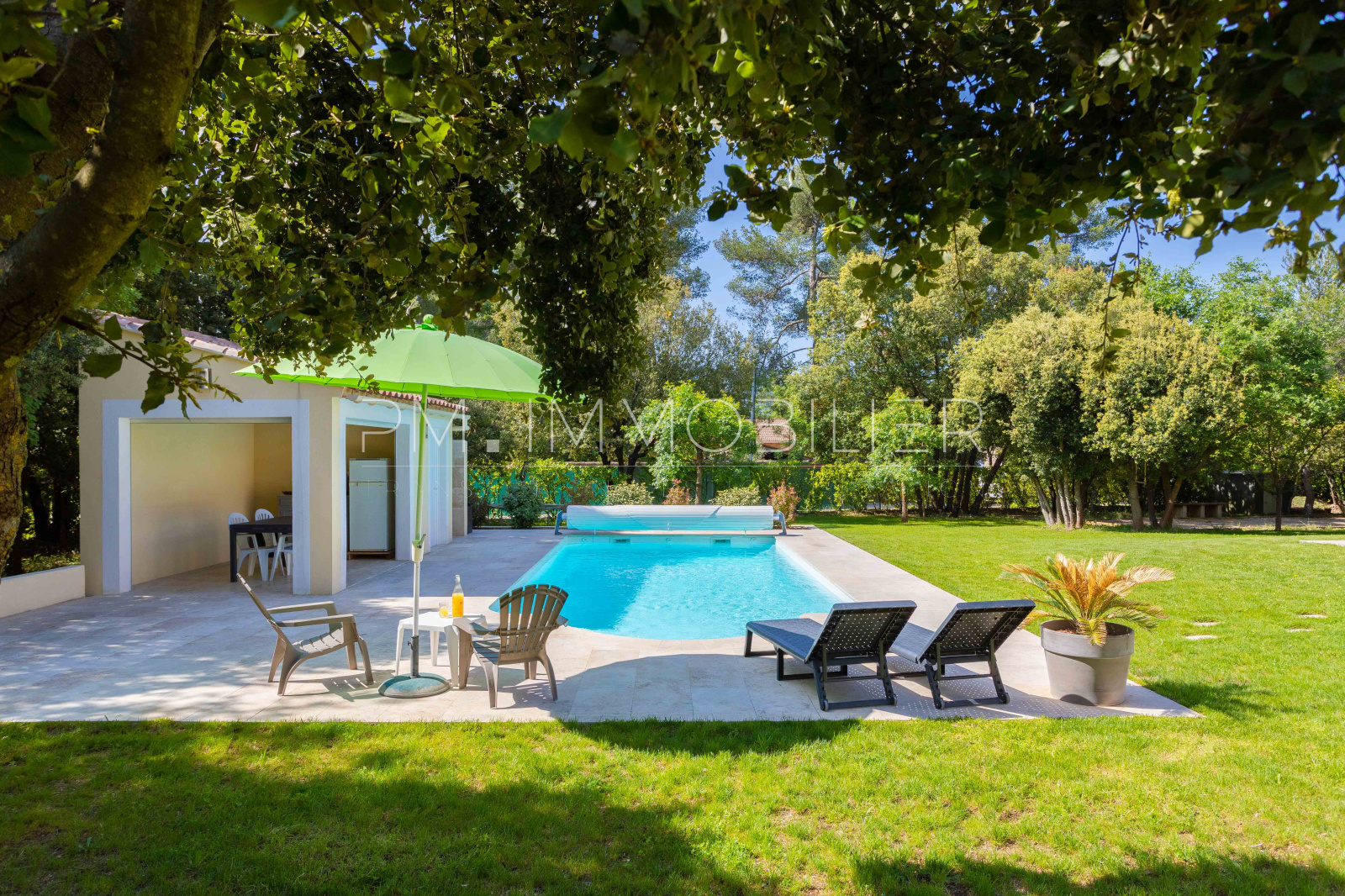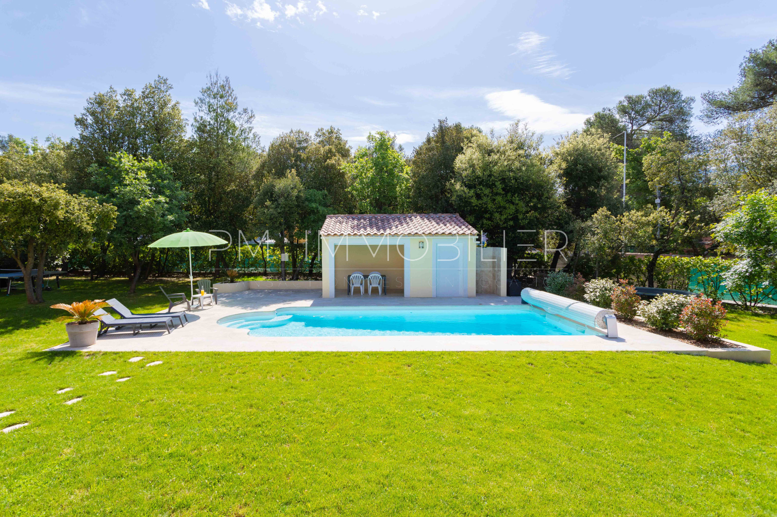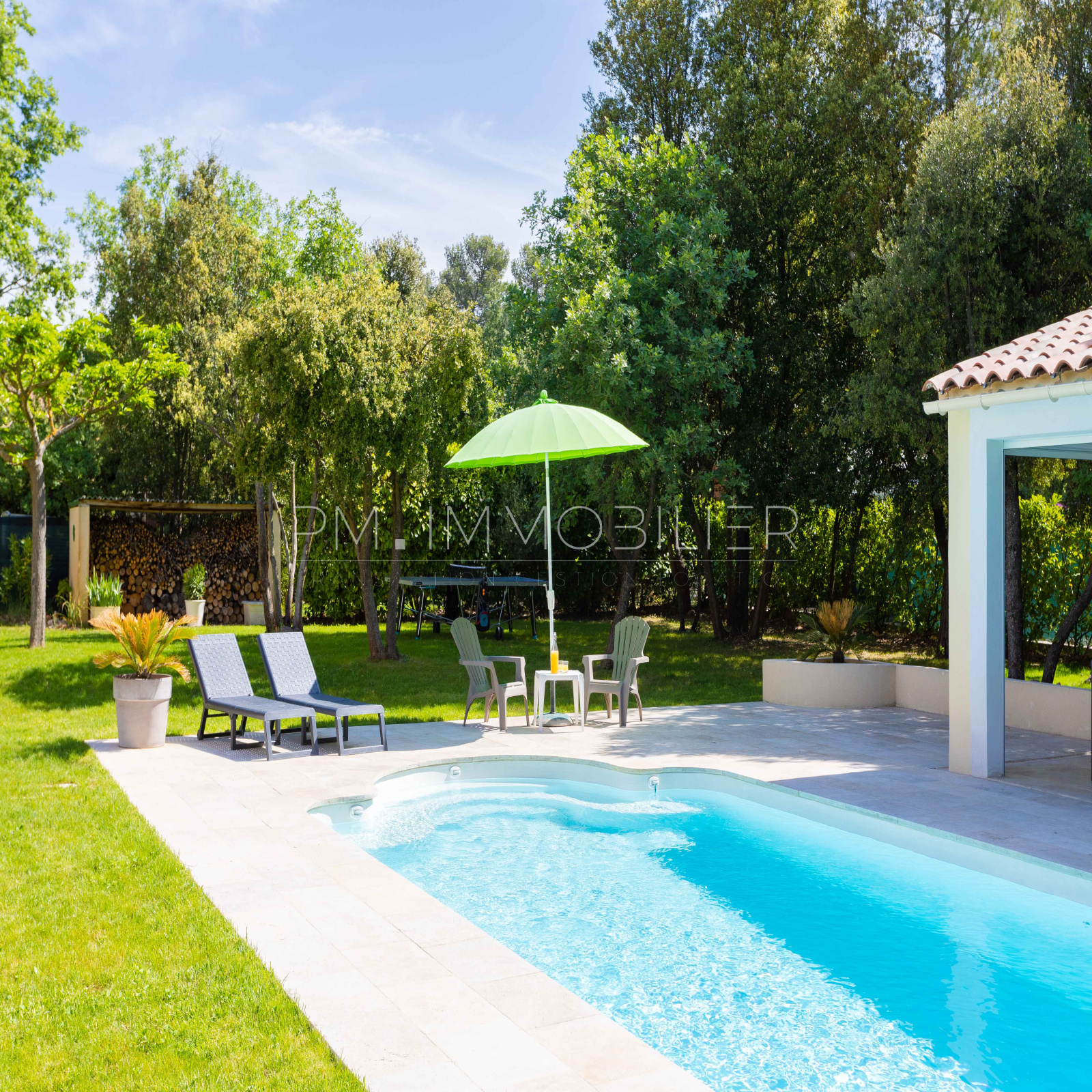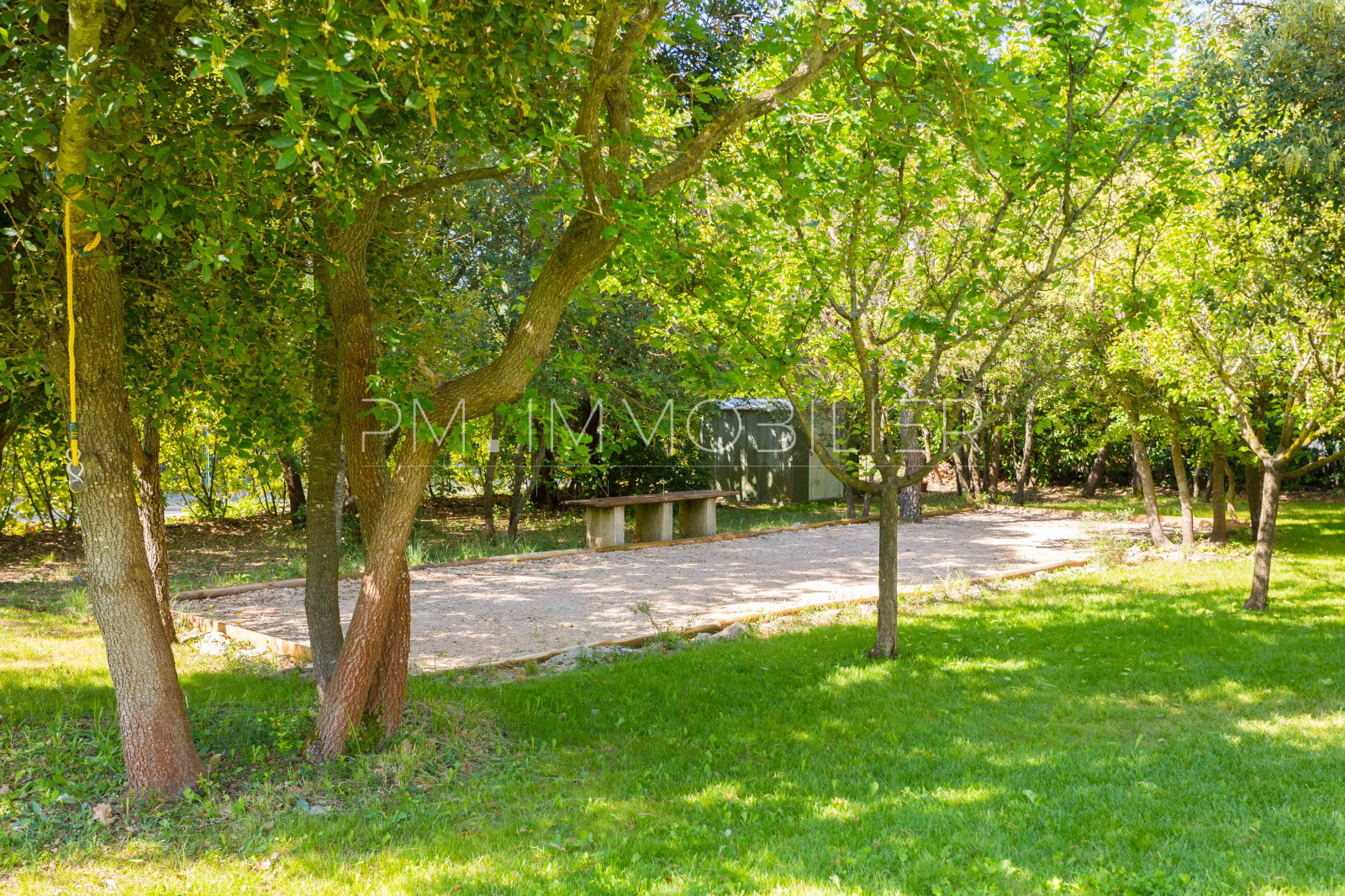 A l'extérieur, un grand jardin très bien entretenu invite à la détente : Terrain de boules, terrasse, pool house... grande piscine au sel de mer entourée d'une large plage en travertin de 80m².