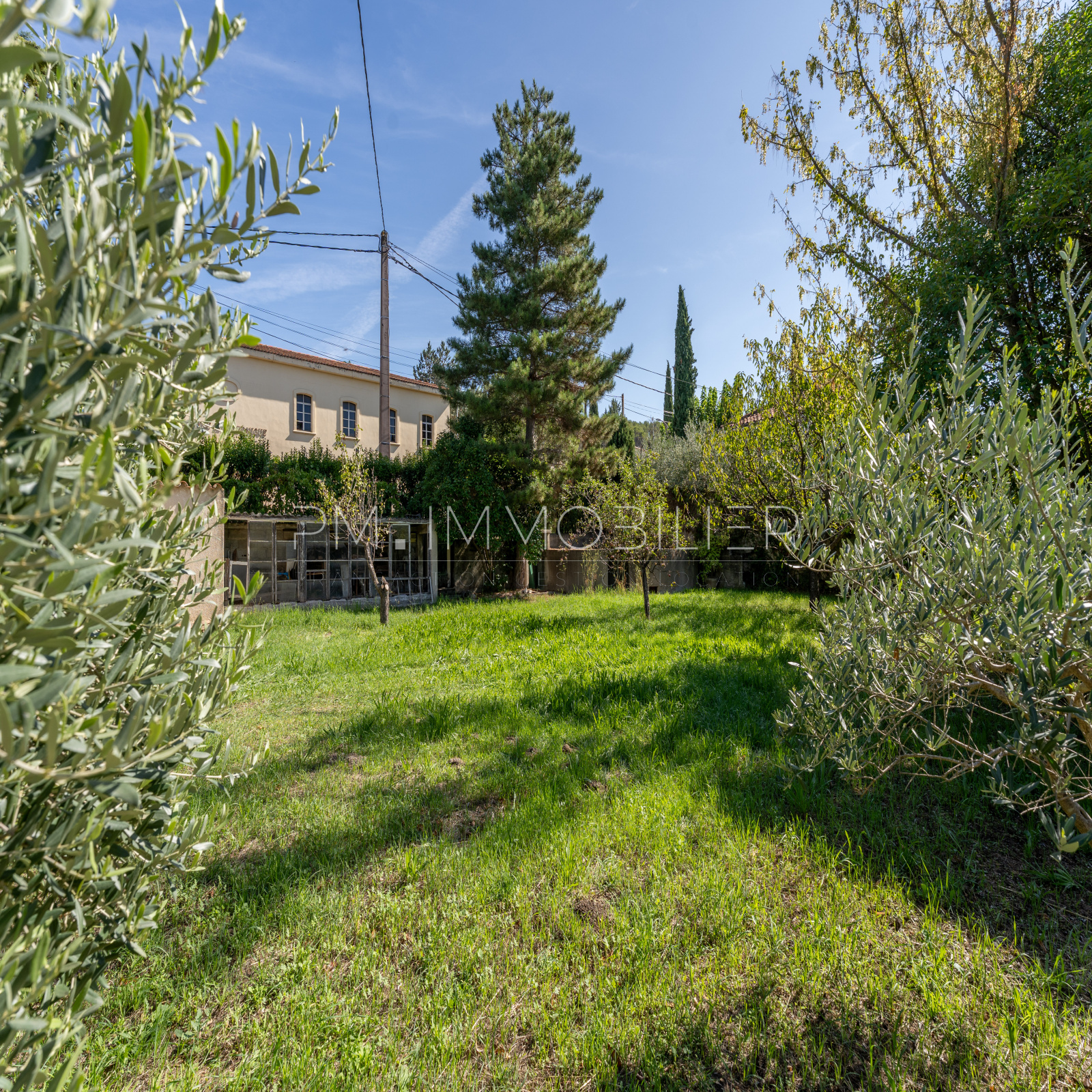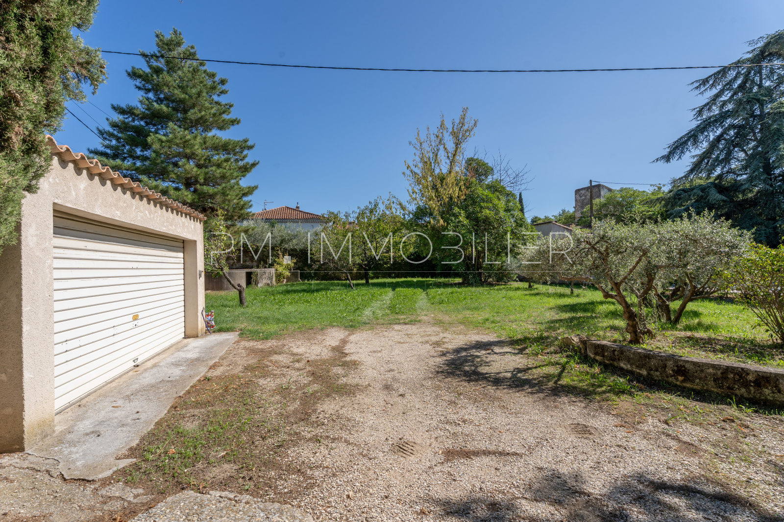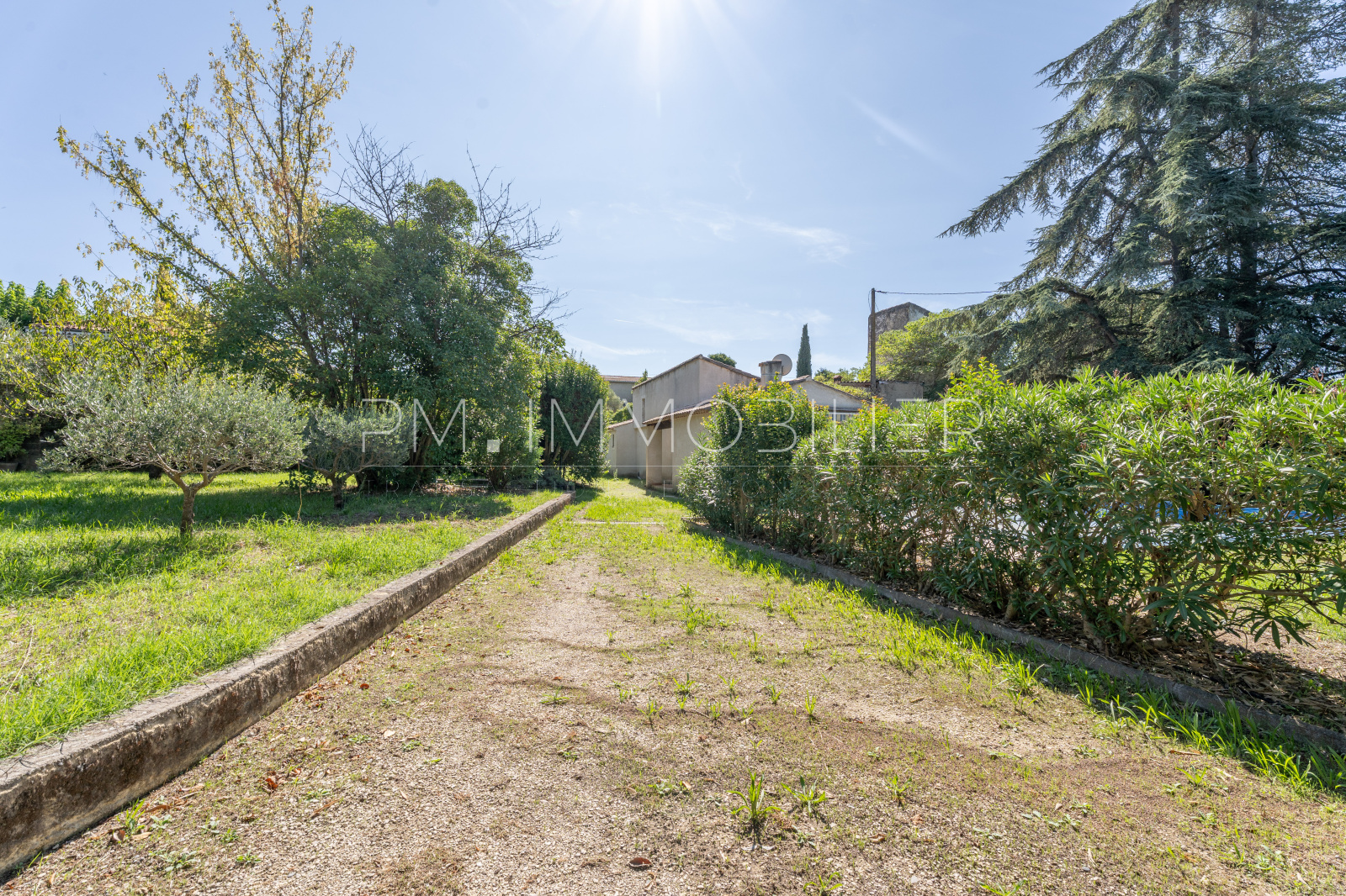 Le jardin, planté d’oliviers, de vignes et d’essences méditerranéennes, est équipé d’un forage et d’un arrosage automatique.