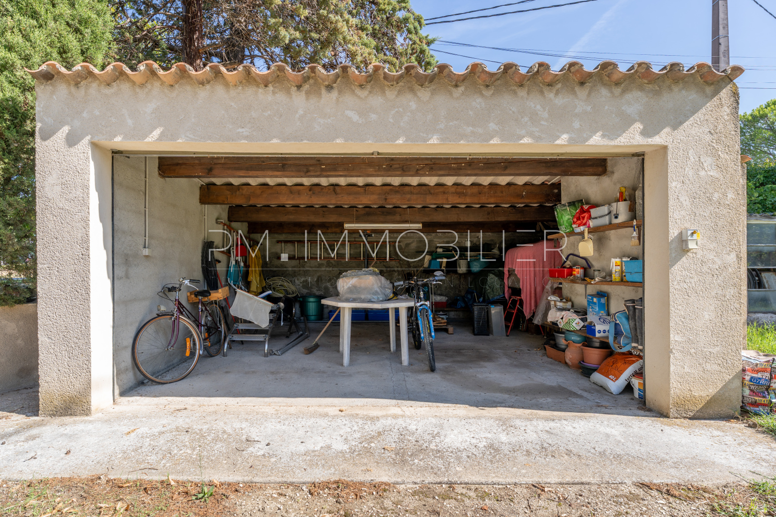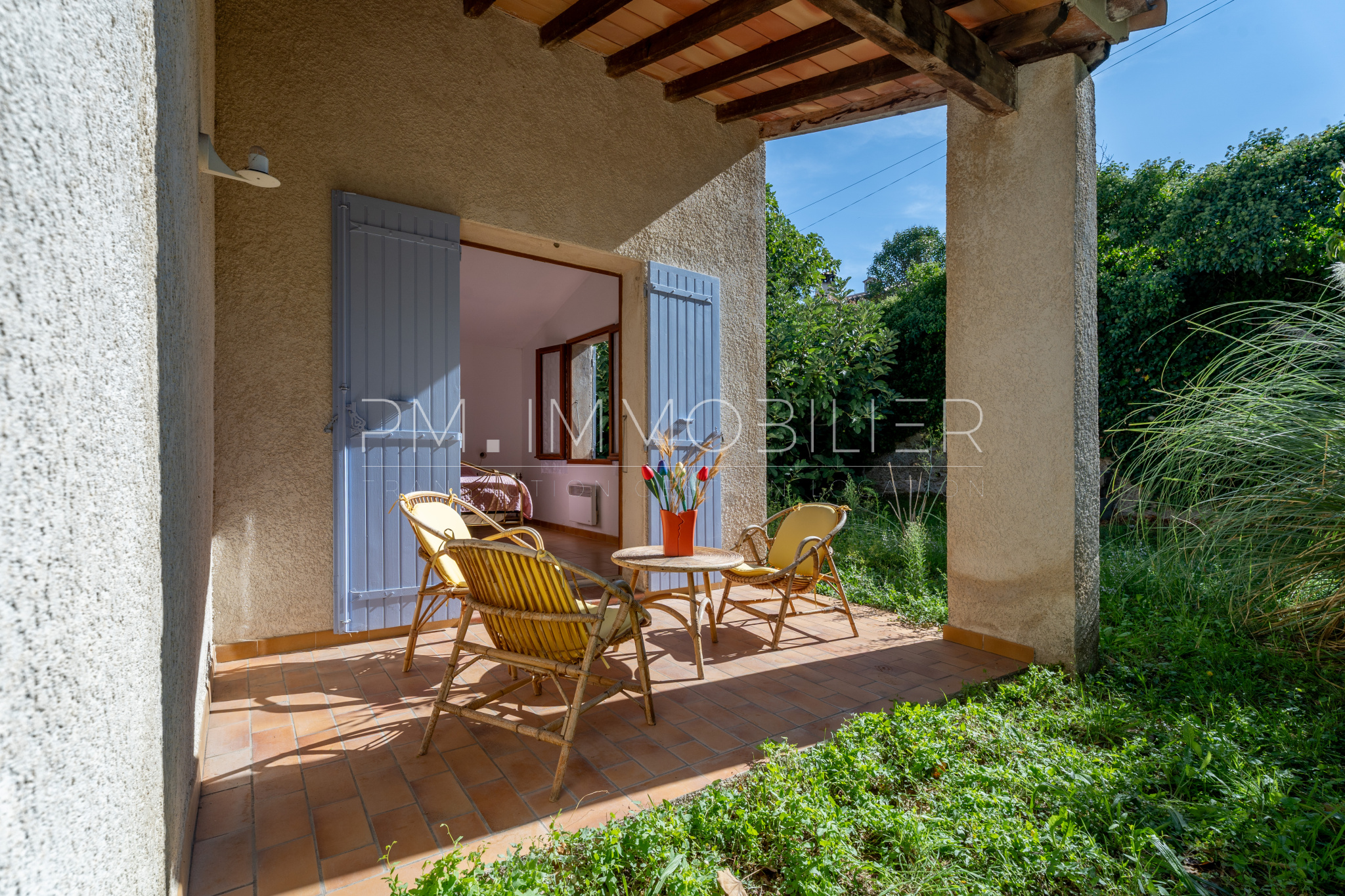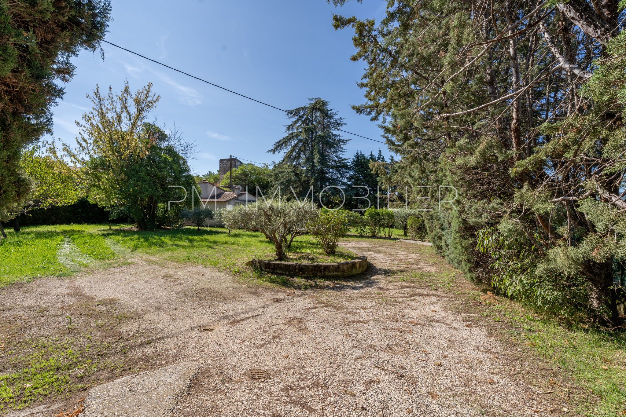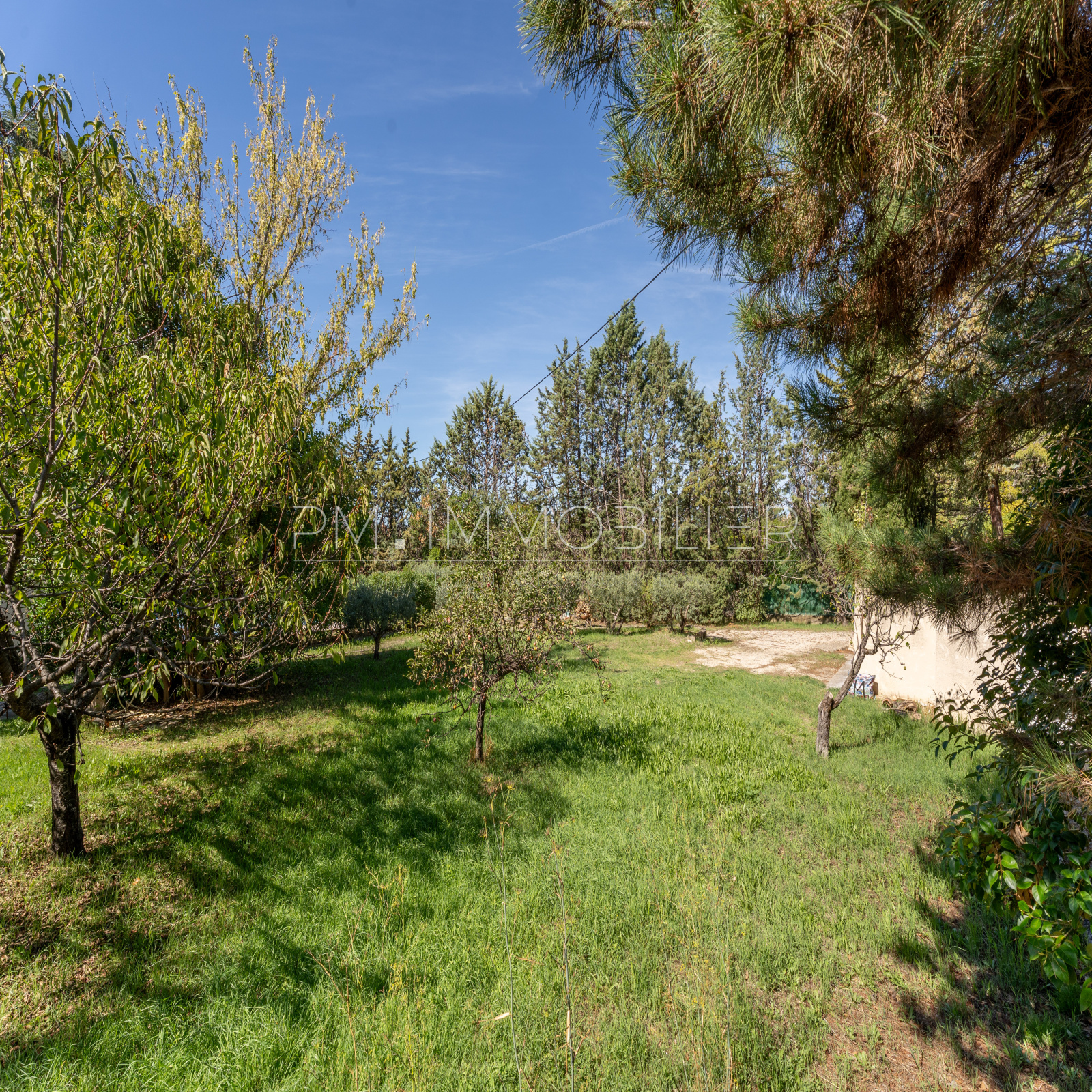 Le jardin, planté d’oliviers, de vignes et d’essences méditerranéennes, est équipé d’un forage et d’un arrosage automatique.