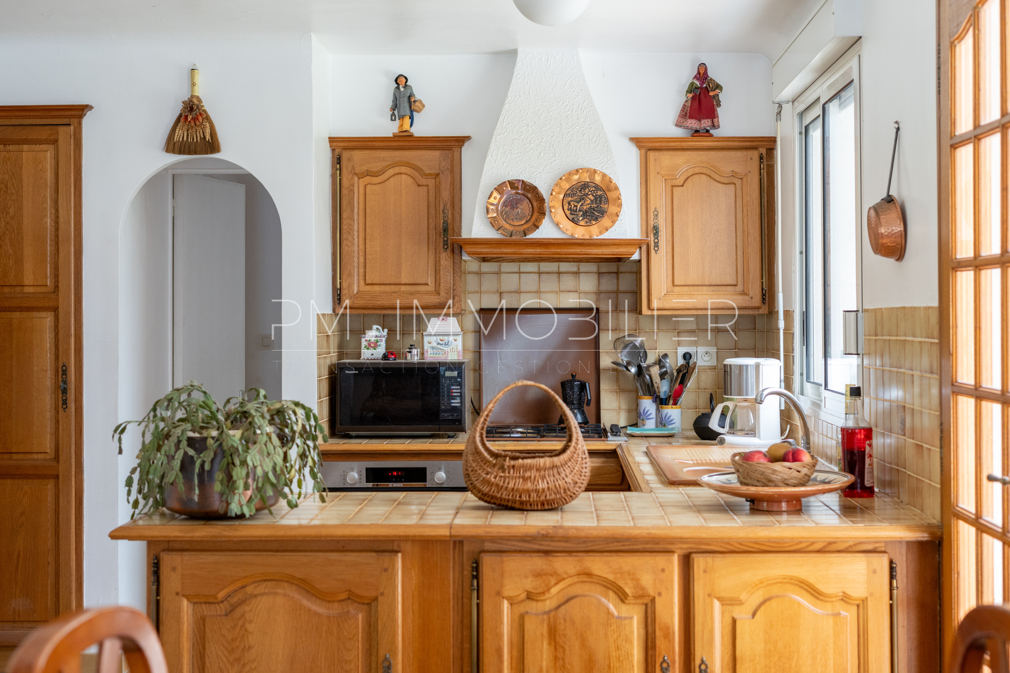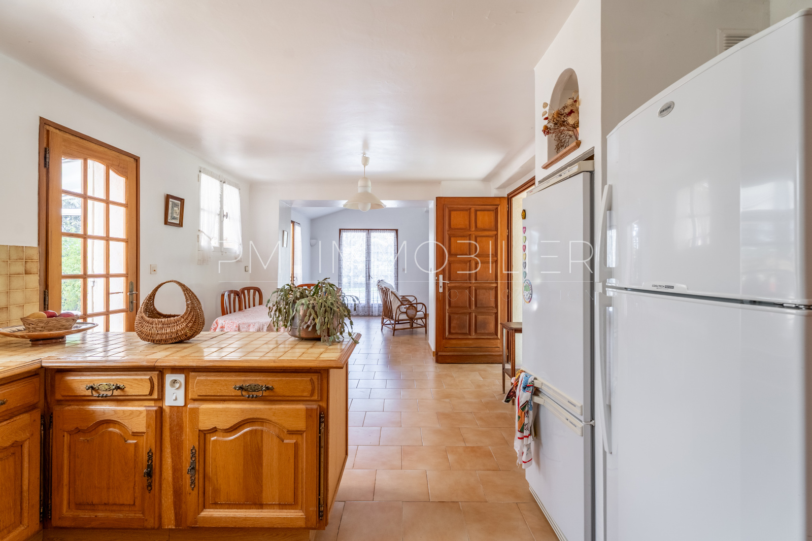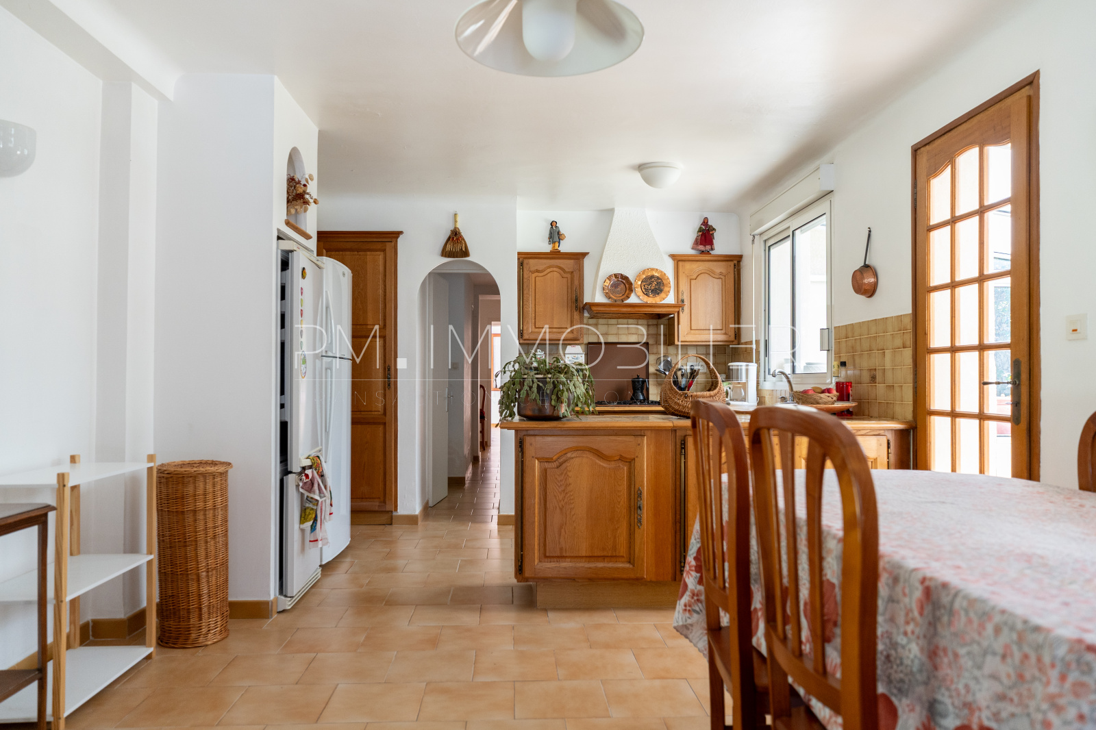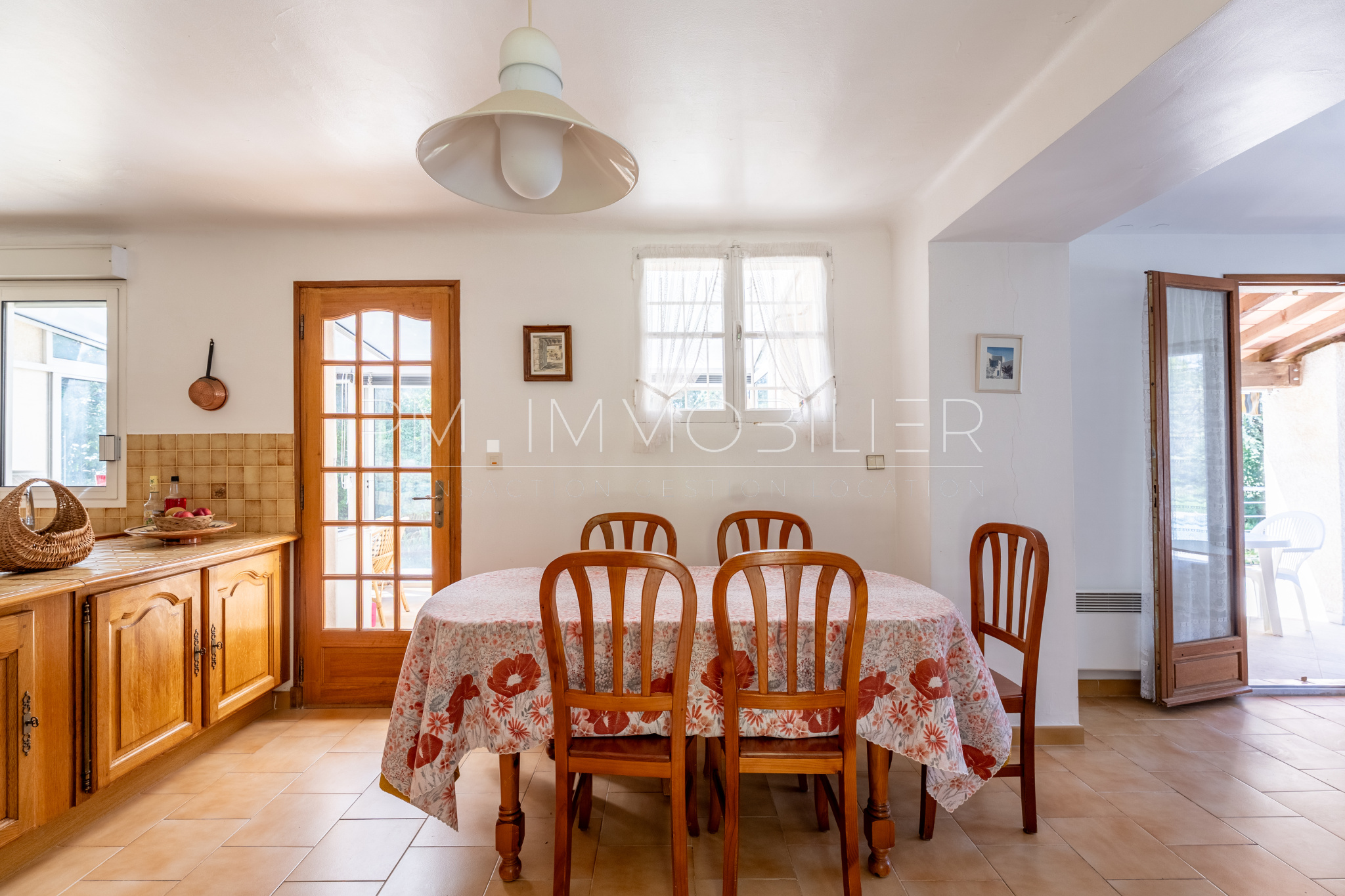 L’espace de vie se compose d’un salon chaleureux, d’une salle à manger lumineuse et d’une cuisine ouverte au style traditionnel. En continuité, une véranda plein sud fait office de salon d’hiver et s’ouvre sur la terrasse et la piscine.
